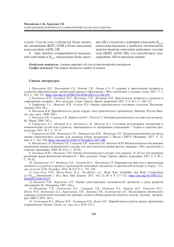 6. Говорухина А.А., Муштай К.А., Коломиец С.В., Мальков О.А. Состояние регуляторных механизмов и компонентный состав тела студенток, занимающихся по программам спортизации // Теория и практика физ. культуры. 2021. No 1. С. 35-37. EDN: AMJJRI