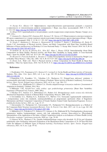 8. Михайлова С.В., Полякова Т.В., Сидорова Т.В., Антонов А.Я., Махонин М.Ю. Физиологическое обоснование применения индекса компонентного состава тела как показателя уровня фитнес-здоровья // Физ. воспитание и спортив. тренировка. 2020. No 3 (33). С. 70-80. EDN: XNLAHH