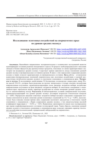 Цель работы - установление взаимосвязи функциональных изменений сперматогенеза при экзогенных воздействиях и уровней промежуточных метаболитов (средних молекул) в гомогенатах семенников и эпидидимисов крыс.