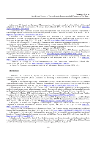 7. Аверьянова И.В. Ответные реакции кардиогемодинамики при локальном холодовом воздействии у жителей приморской и континентальной зон Магаданской области // Экология человека. 2021. No 10. С. 29-36. DOI: 10.33396/1728-0869-2021-10-29-36 EDN: TRHBKE