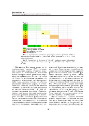 Результаты. Полученные данные доказывают, что внедрение современных экспресс-технологий в учебный процесс способствует улучшению физического здоровья и функционального состояния, оптимизации индексов здоровья и процессов адаптации учащихся. Повышается уровень физического здоровья школьников, снижаются показатели отклонений в состоянии здоровья. Разработка программ физической культуры для контингентов школьников с различным уровнем здоровья при современной информатизации учебного процесса приобретает определяющее значение для педагогического контроля здоровья и процессов адаптации в условиях ускоренного возрастания учебных нагрузок.