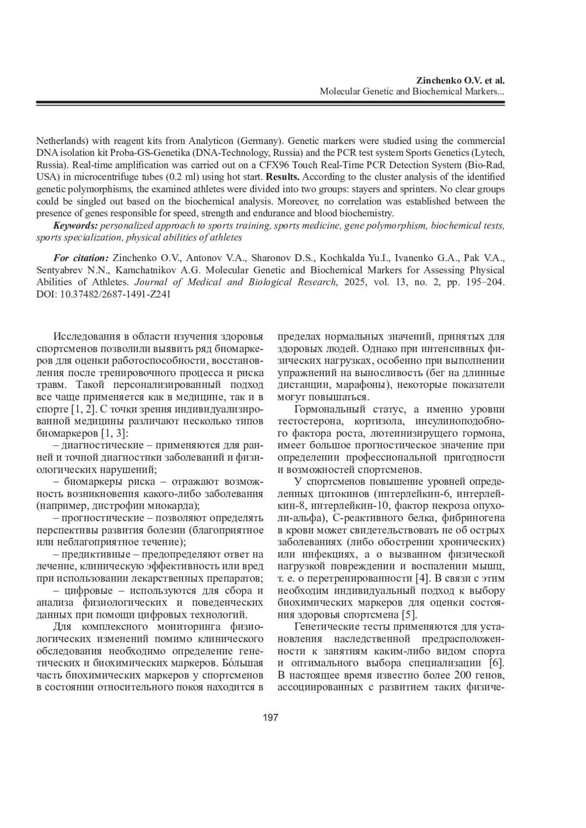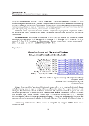 Результаты. При оценке выявленных генетических полиморфизмов с помощью кластерного анализа удалось условно разделить обследуемых спортсменов на две группы: «стайеры» и «спринтеры». На основании биохимического исследования разделения на какие-либо четкие группы добиться не удалось. Установлено отсутствие корреляции между наличием генов, отвечающих за быстроту, силу, выносливость, и показателями биохимии крови.