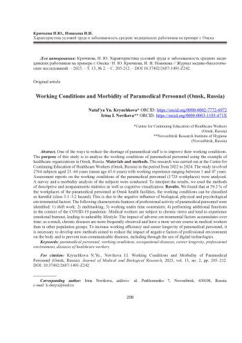 Результаты. На основании оценки условий труда установлено, что 59,2 % рабочих мест средних медицинских работников в лечебно-профилактических организациях г. Омска соответствовали 3.1-3.2 классам (вредные условия труда). Это обусловлено негативным влиянием биологических, физических и психологических факторов внешней среды. Отмечены следующие особенности профессиональной деятельности среднего медицинского персонала: 1) сменный график работы; 2) многозадачность; 3) работа в условиях дефицита времени; 4) выполнение дополнительных функций в условиях пандемии COVID-19. Медицинские работники подвержены хроническому стрессу, для них характерно эмоциональное выгорание, способствующее отказу от ведения здорового образа жизни. Воздействие негативных факторов внешней среды накапливается со временем, в результате у медицинских работников с возрастом хронические заболевания развиваются чаще и протекают тяжелее по сравнению с другими группами населения. Для повышения эффективности профессиональной деятельности и трудового долголетия средних медицинских работников необходима разработка современных методов, позволяющих снизить влияние негативных факторов профессиональной среды на их организм, а также методов профилактики неинфекционных заболеваний, в т. ч. с применением цифровых технологий.
