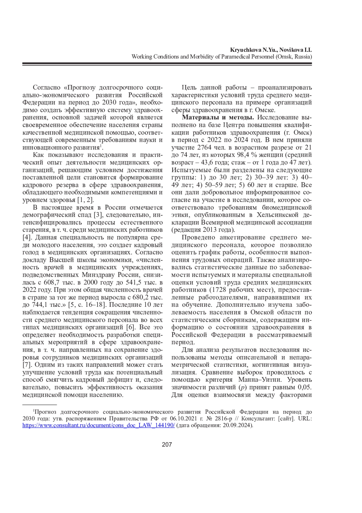 Материалы и методы. Работа выполнена на базе Центра повышения квалификации работников здравоохранения (г. Омск) в период с 2022 по 2024 год. В исследовании приняли участие 2764 чел. в возрасте от 21 до 74 лет (средний возраст - 43,6 года; стаж - от 1 года до 47 лет). Проанализированы отчеты по оценке условий работы среднего медицинского персонала (1728 рабочих мест). Проведены анкетирование, анализ заболеваемости испытуемых. Для интерпретации результатов использовались методы описательной, непараметрической статистики и когнитивной визуализации.