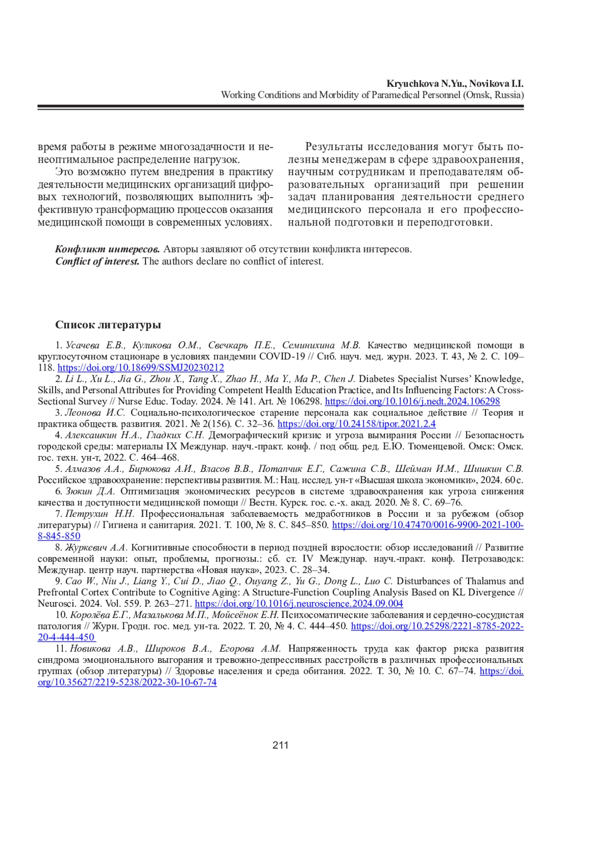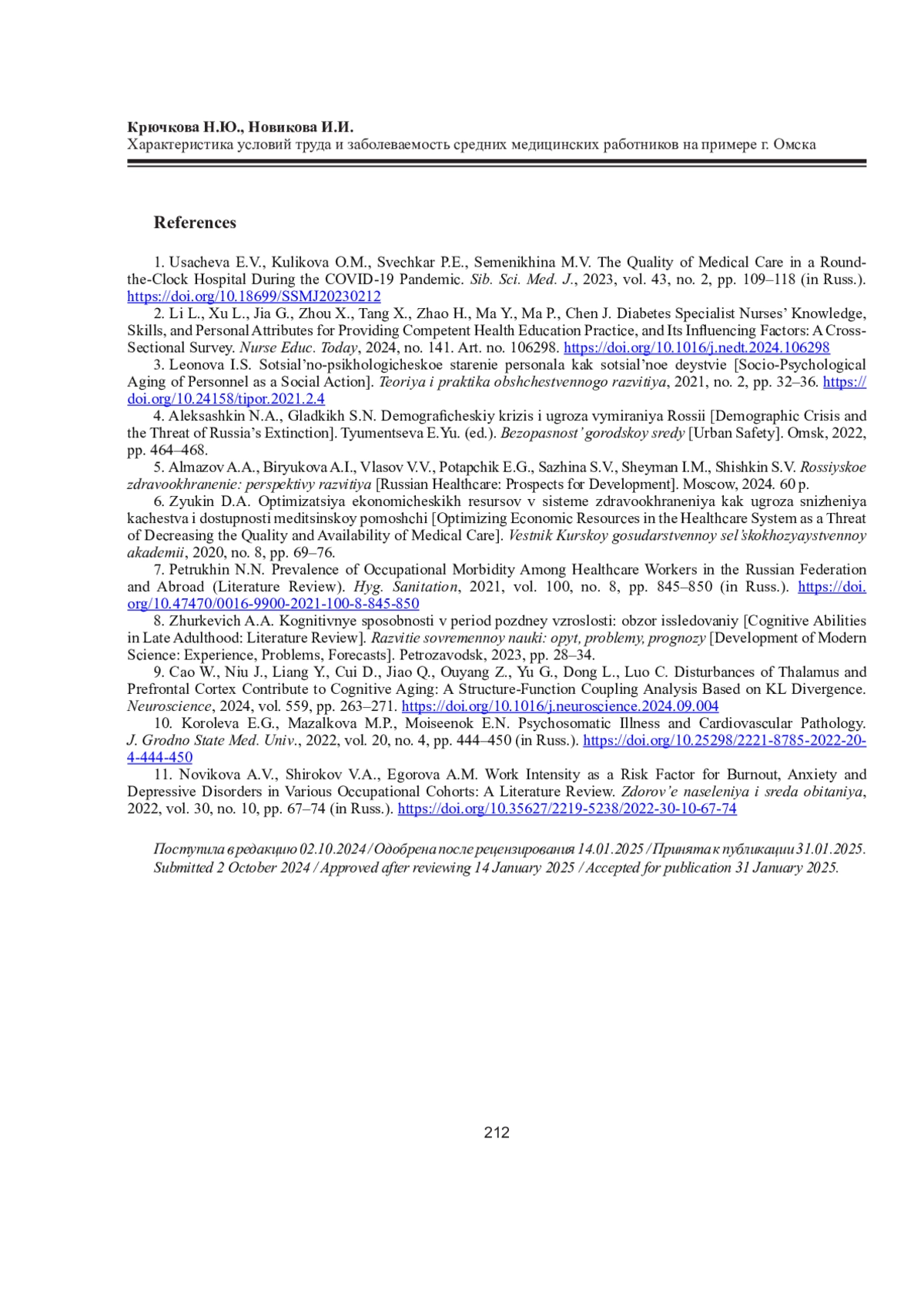1. Усачева Е.В., Куликова О.М., Свечкарь П.Е., Семинихина М.В. Качество медицинской помощи в круглосуточном стационаре в условиях пандемии COVID-19 // Сиб. науч. мед. журн. 2023. Т. 43, No 2. С. 109- 118. DOI: 10.18699/SSMJ20230212 EDN: DOIKPJ