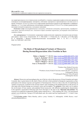 Моноциты и макрофаги играют одну из ключевых ролей в развитии и восстановлении тканей. В настоящее время наблюдается большой интерес к исследованию этих клеток в связи с их потенциалом в терапевтической регенерации, поскольку они выполняют фагоцитарную функцию, участвуют в иммунном ответе и регуляции гемопоэза. Однако данные о роли морфологических вариантов моноцитов, локализованных в красном костном мозге и циркулирующих в периферической крови, в процессе восстановления кожных покровов после термических повреждений единичны и разрозненны.