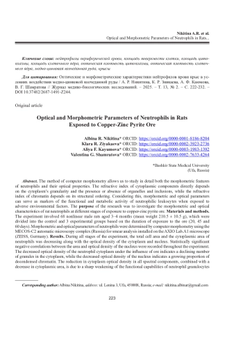 Целью исследования явилось изучение морфометрических и оптических показателей нейтрофилов крыс на различных сроках интоксикации медно-цинковой колчеданной рудой.
