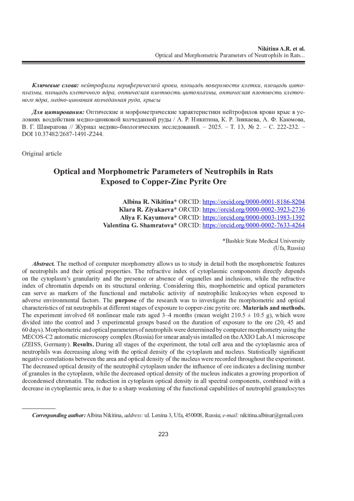 Материалы и методы. В эксперименте использовались 68 нелинейных крыс-самцов 3-4-месячного возраста (средняя масса тела 210,5±10,5 г), которые были разделены на контрольную и три опытных группы в зависимости от срока интоксикации рудой (20, 45 и 60 сут.). Морфометрические и оптические показатели нейтрофилов определялись методом компьютерной морфометрии с помощью комплекса автоматической микроскопии «Мекос-Ц2» (Россия) для анализа мазков, установленного на микроскопе AXIO Lab. A1 (ZEISS, Германия).