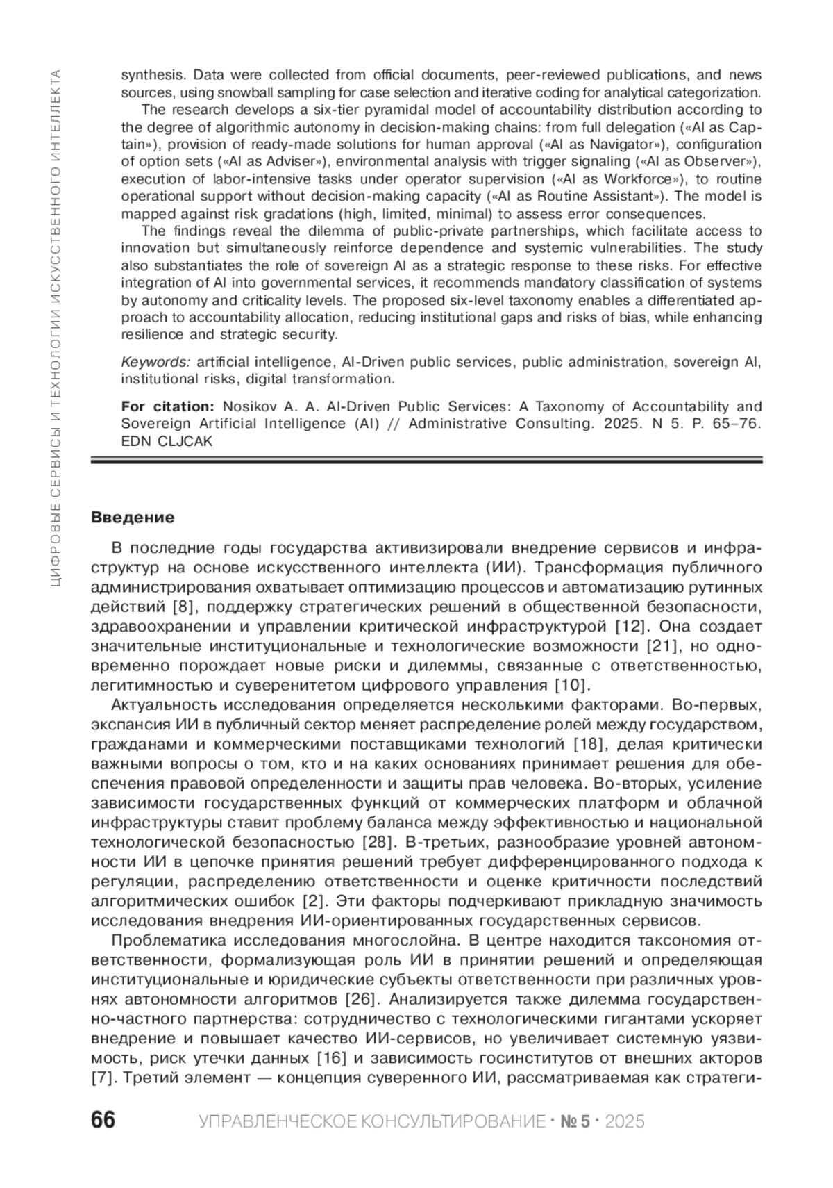 Настоящее исследование анализирует институциональные и технологические вызовы интеграции систем искусственного интеллекта (ИИ) в публичное администрирование и государственные сервисы, фокусируясь на классификации ролей алгоритмов в процессах принятия решений, балансе интересов в сотрудничестве с коммерческими поставщиками ИИ-решений и инфраструктуры, а также обеспечении национальной технологической автономии. Применен качественный междисциплинарный подход, сочетающий нормативноправовой анализ, тематический анализ эмпирических кейсов из практики различных стран и теоретический синтез. Данные собраны из официальных источников, рецензируемых научных публикаций и новостных источников с использованием метода снежного кома для отбора кейсов, а кодирование проводилось итеративно. В результате разработана оригинальная авторская шестиуровневая пирамидальная модель распределения ответственности в зависимости от степени автономии алгоритмов ИИ в цепочке принятия решений: от полной делегации («ИИ-Капитан») через предложение готового решения с утверждением человеком («ИИ-Штурман»), набор конфигураций («ИИ-Советник»), анализ среды с сигнализацией триггеров («ИИ-Наблюдатель» ), выполнение трудозатратных задач с ревизией оператором («ИИ-Рабочие руки») до рутинной поддержки без решений («ИИ-Рутинный помощник»). Модель наложена на градации рисков (высокий, ограниченный, минимальный) для оценки последствий ошибок. Выявлена дилемма государственно-частного партнерства, обеспечивающего доступ к инновациям, но усиливающего зависимость и уязвимости. Также обоснована роль суверенного ИИ как стратегии снижения этих рисков. Для эффективной интеграции алгоритмов в государственные сервисы рекомендуется внедрение обязательной классификации систем ИИ по уровням автономии и критичности, где шестиуровневая таксономия обеспечивает дифференцированный подход к распределению ответственности, минимизируя институциональные пробелы и риски предвзятости.