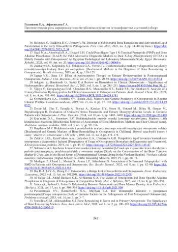 35. Игнатенко Г.А., Немсадзе И.Г., Мирович Е.Д., Чурилов А.В., Майлян Э.А., Глазков А.Э., Румянцева З.С. Роль цитокинов в ремоделировании костной ткани и патогенезе постменопаузального остеопороза // Мед. вестн. Юга России. 2020. Т. 11, No 2. С. 6-18. DOI: 10.21886/2219-8075-2020-11-2-6-18 EDN: JLMNIV