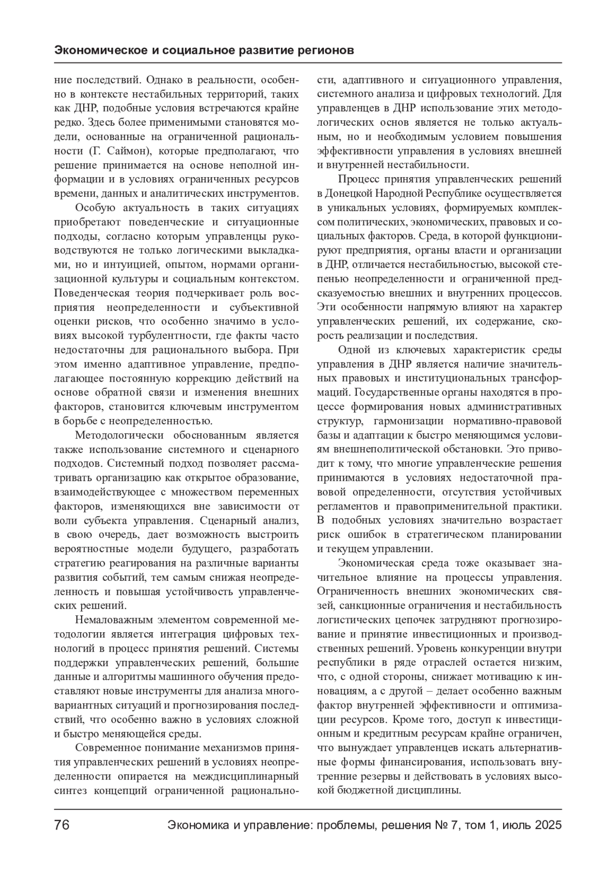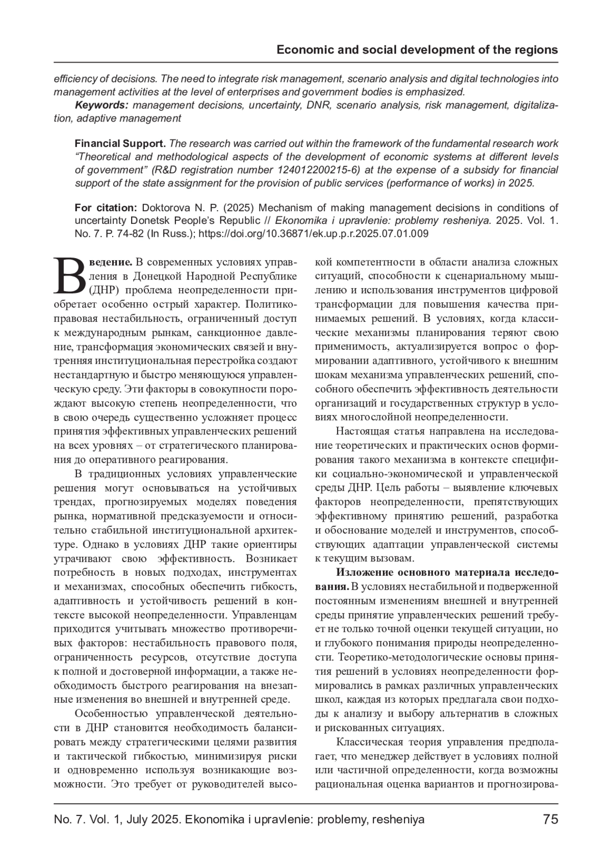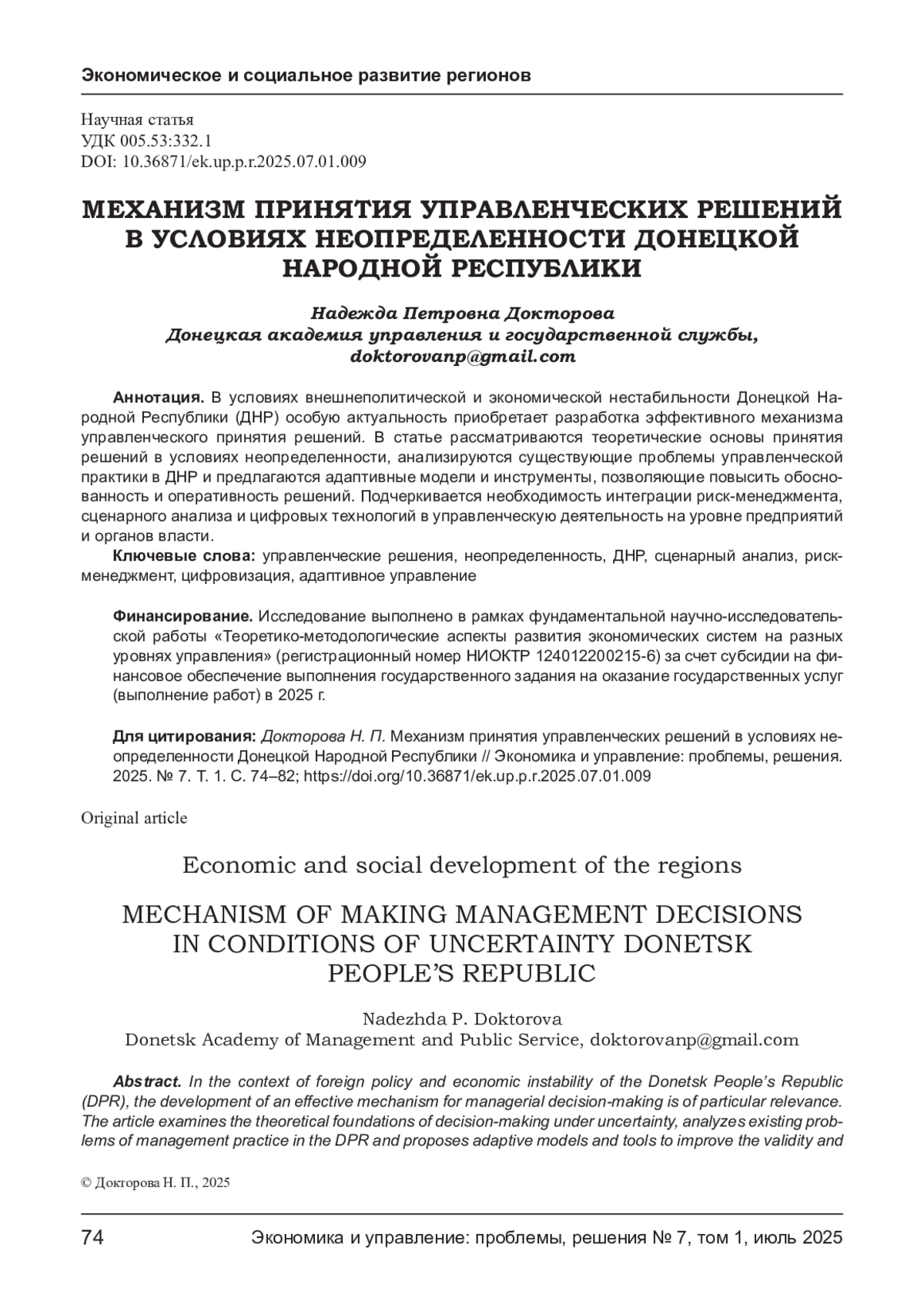 В условиях внешнеполитической и экономической нестабильности Донецкой Народной Республики (ДНР) особую актуальность приобретает разработка эффективного механизма управленческого принятия решений. В статье рассматриваются теоретические основы принятия решений в условиях неопределенности, анализируются существующие проблемы управленческой практики в ДНР и предлагаются адаптивные модели и инструменты, позволяющие повысить обоснованность и оперативность решений. Подчеркивается необходимость интеграции риск-менеджмента, сценарного анализа и цифровых технологий в управленческую деятельность на уровне предприятий и органов власти.