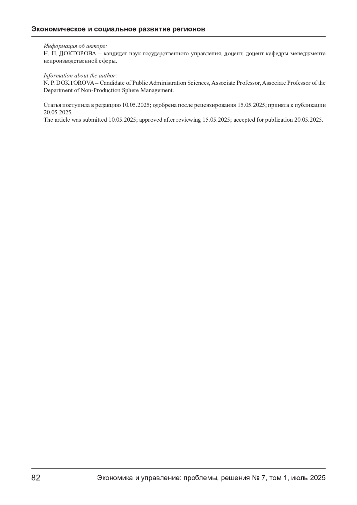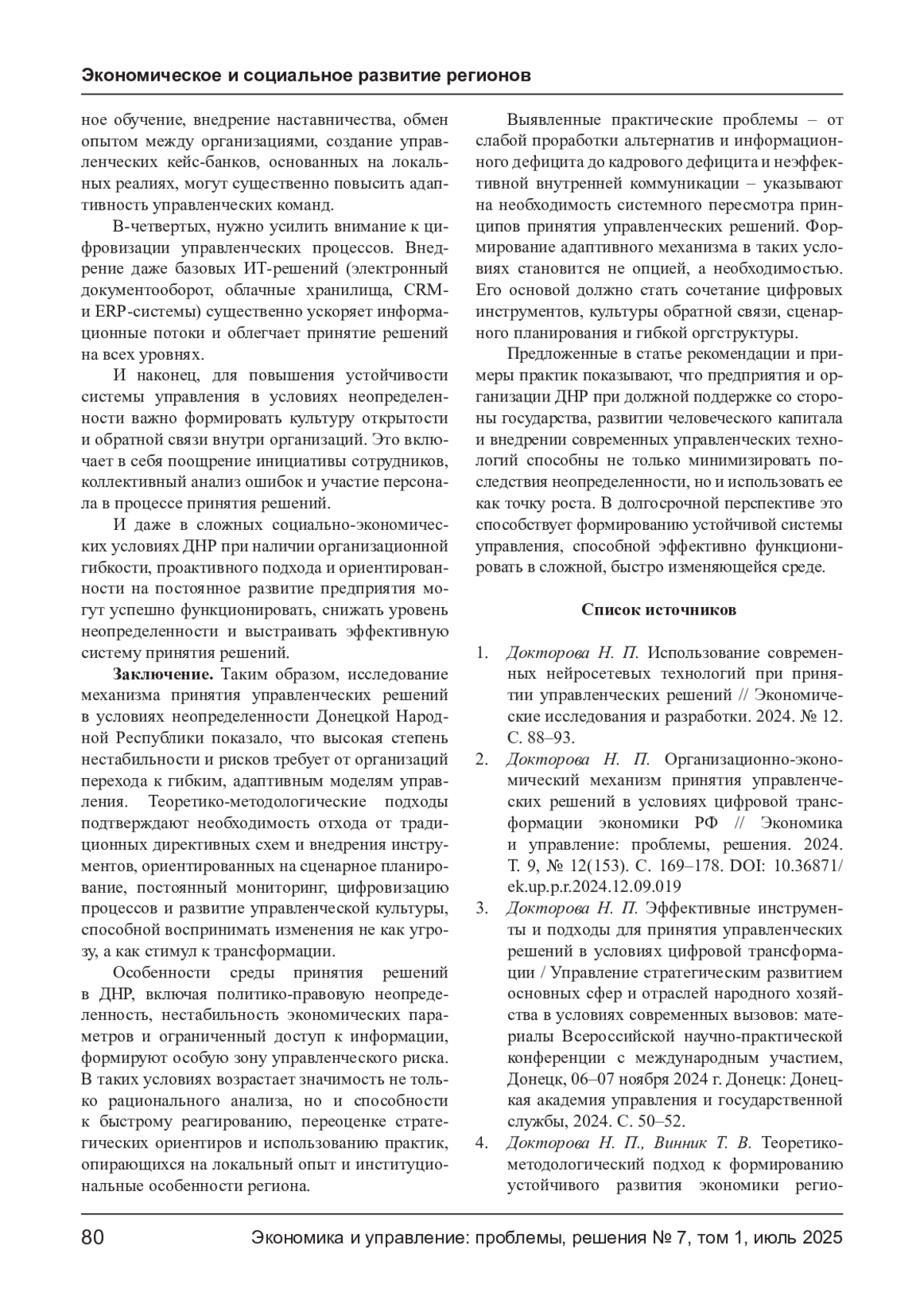2. Докторова Н. П. Организационно-экономический механизм принятия управленческих решений в условиях цифровой трансформации экономики РФ // Экономика и управление: проблемы, решения. 2024. Т. 9, № 12(153). С. 169-178. 10.36871/ ek.up.p.r.2024.12.09.019. DOI: 10.36871/ek.up.p.r.2024.12.09.019 EDN: ASXJFW