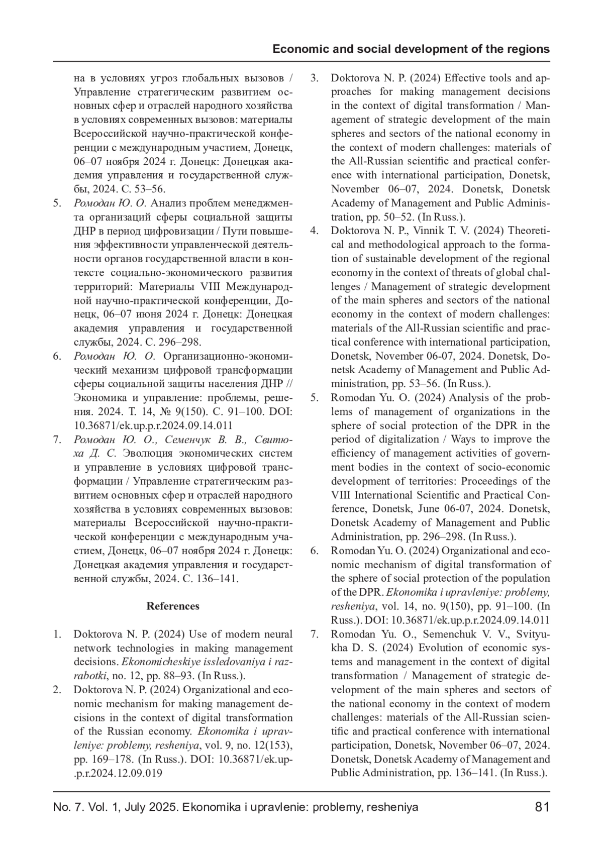 6. Ромодан Ю. О. Организационно-экономический механизм цифровой трансформации сферы социальной защиты населения ДНР // Экономика и управление: проблемы, решения. 2024. Т. 14, № 9(150). С. 91-100. DOI: 10.36871/ek.up.p.r.2024.09.14.011 EDN: DCISNA