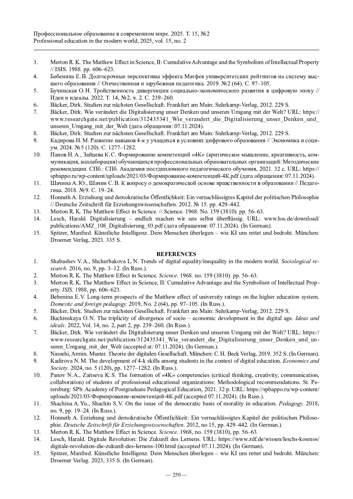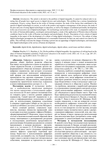 ШАЧИНА А. Ю., ШАЧИН С. В. К ПРОБЛЕМЕ ЦИФРОВОГО НЕРАВЕНСТВА: ОПЫТ ОСМЫСЛЕНИЯ НА ОСНОВЕ ИДЕЙ НЕМЕЦКИХ УЧЕНЫХ-ГУМАНИТАРИЕВ // ПРОФЕССИОНАЛЬНОЕ ОБРАЗОВАНИЕ В СОВРЕМЕННОМ МИРЕ. 2025. Т. 15, № 2