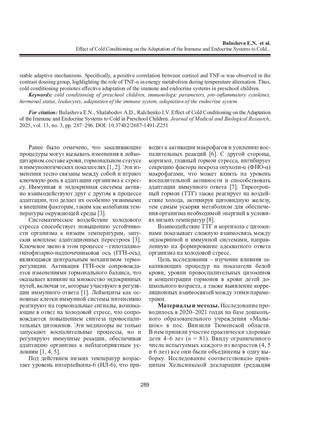 Закаливающие процедуры могут вызывать изменения в лейкоцитарном составе крови, гормональном статусе и иммунологических показателях, тем самым играя ключевую роль в адаптации организма к низким температурам. Взаимодействие иммунной и эндокринной систем обеспечивает развитие адаптационных механизмов, что делает эти системы важными объектами для исследования. Цель работы - изучить влияние закаливания на показатели белой крови, уровни провоспалительных цитокинов и концентрации гормонов у детей дошкольного возраста, а также выявить корреляционные связи между этими параметрами.