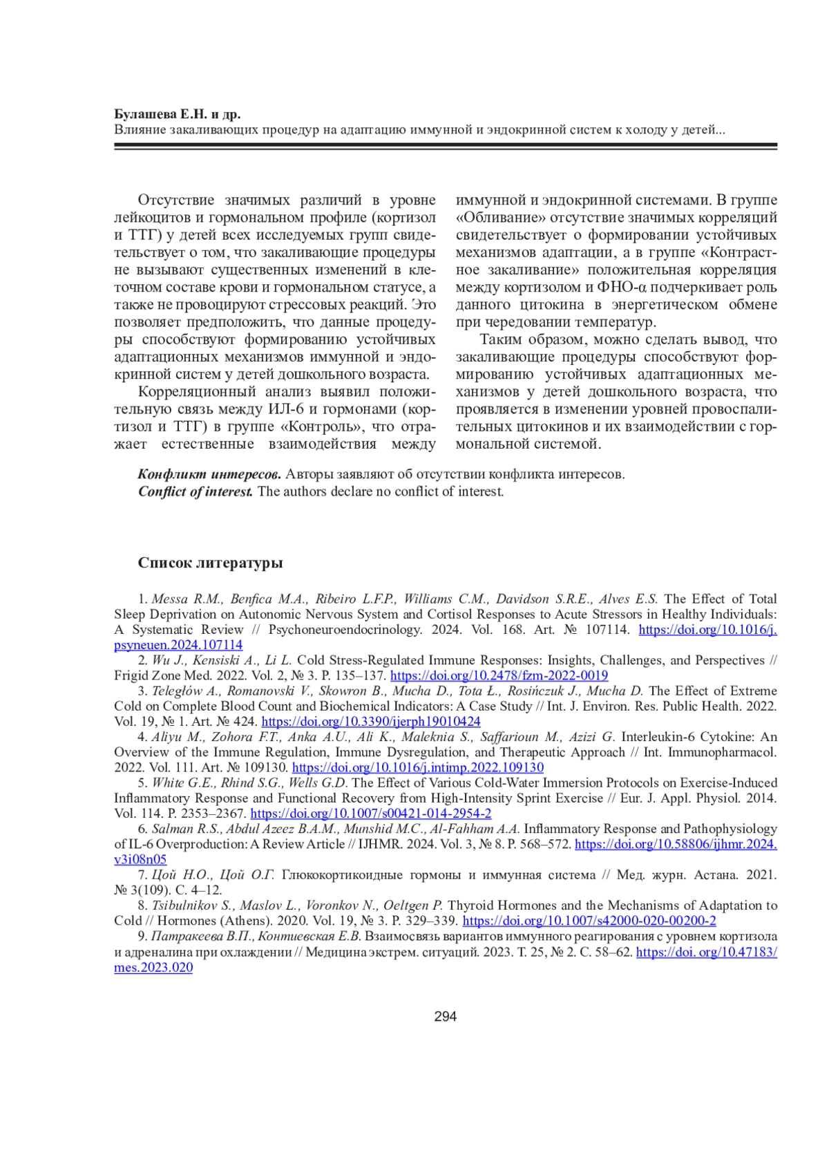 9. Патракеева В.П., Контиевская Е.В. Взаимосвязь вариантов иммунного реагирования с уровнем кортизола и адреналина при охлаждении // Медицина экстрем. ситуаций. 2023. Т. 25, No 2. С. 58-62. 10.47183/ mes.2023.020. DOI: 10.47183/mes.2023.020