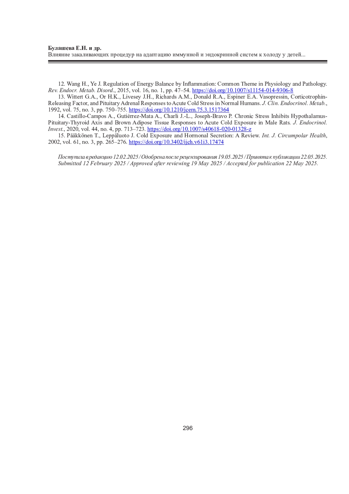15. Pääkkönen T., Leppäluoto J. Cold Exposure and Hormonal Secretion: A Review // Int. J. Circumpolar Health. 2002. Vol. 61, No 3. P. 265-276. DOI: 10.3402/ijch.v61i3.17474