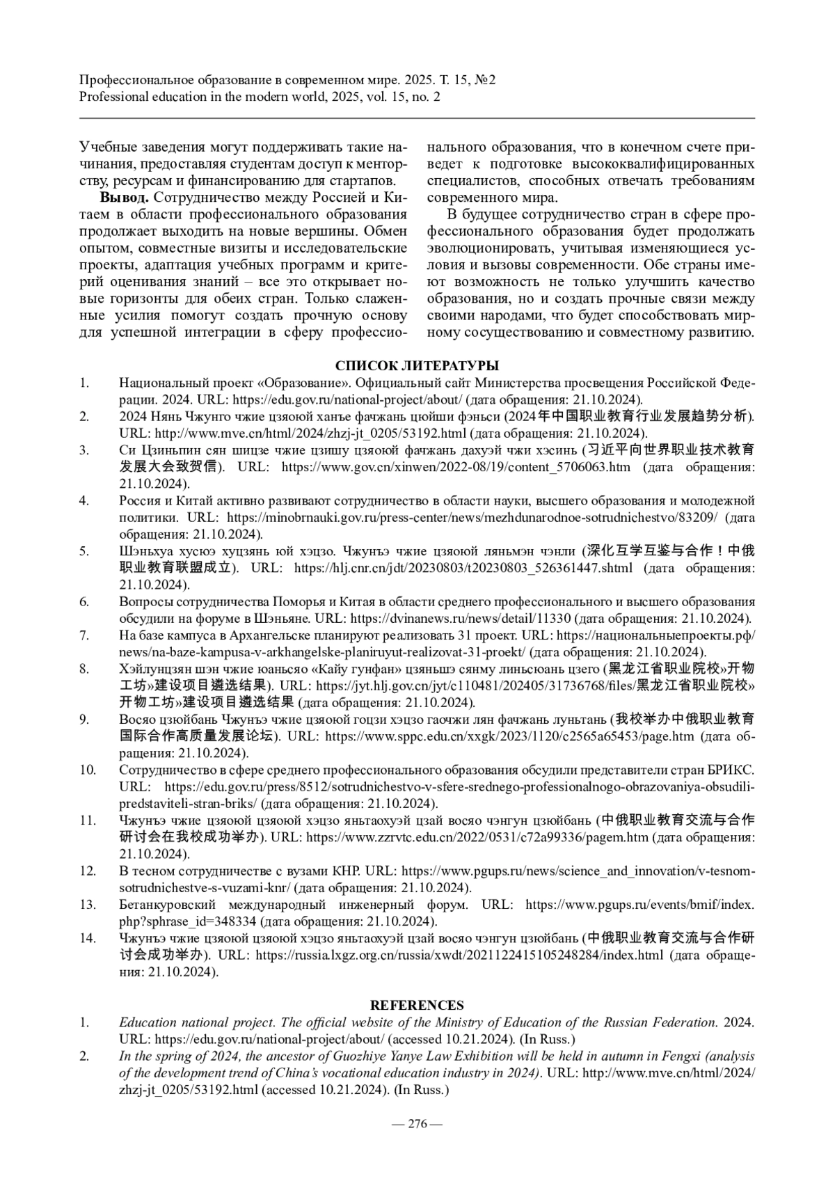 5. Шэньхуа хусюэ хуцзянь юй хэцзо. Чжунъэ чжие цзяоюй ляньмэн чэнли (深化互学互鉴与合作!中俄 职业教育联盟成立). URL: https://hlj.cnr.cn/jdt/20230803/t20230803_526361447.shtml (дата обращения: 21.10.2024).