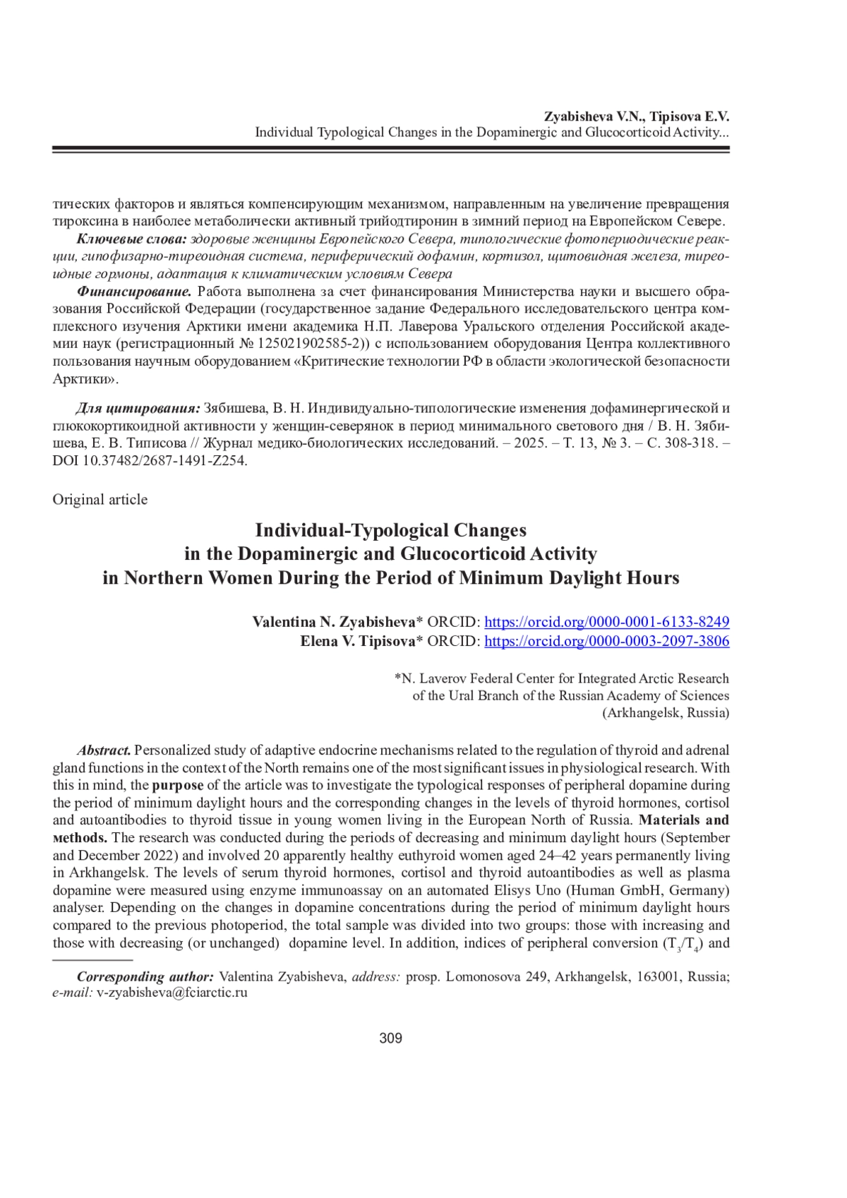 11. Зябишева В.Н., Типисова Е.В., Елфимова А.Э., Молодовская И.Н., Аликина В.А. Типологические изменения уровня дофамина, кортизола и тиреоидных гормонов у мужчин г. Архангельска в динамике фотопериодов года // Сиб. науч. мед. журн. 2023. Т. 43, No 6. С. 63-69. DOI: 10.18699/SSMJ20230607 EDN: HPENZR