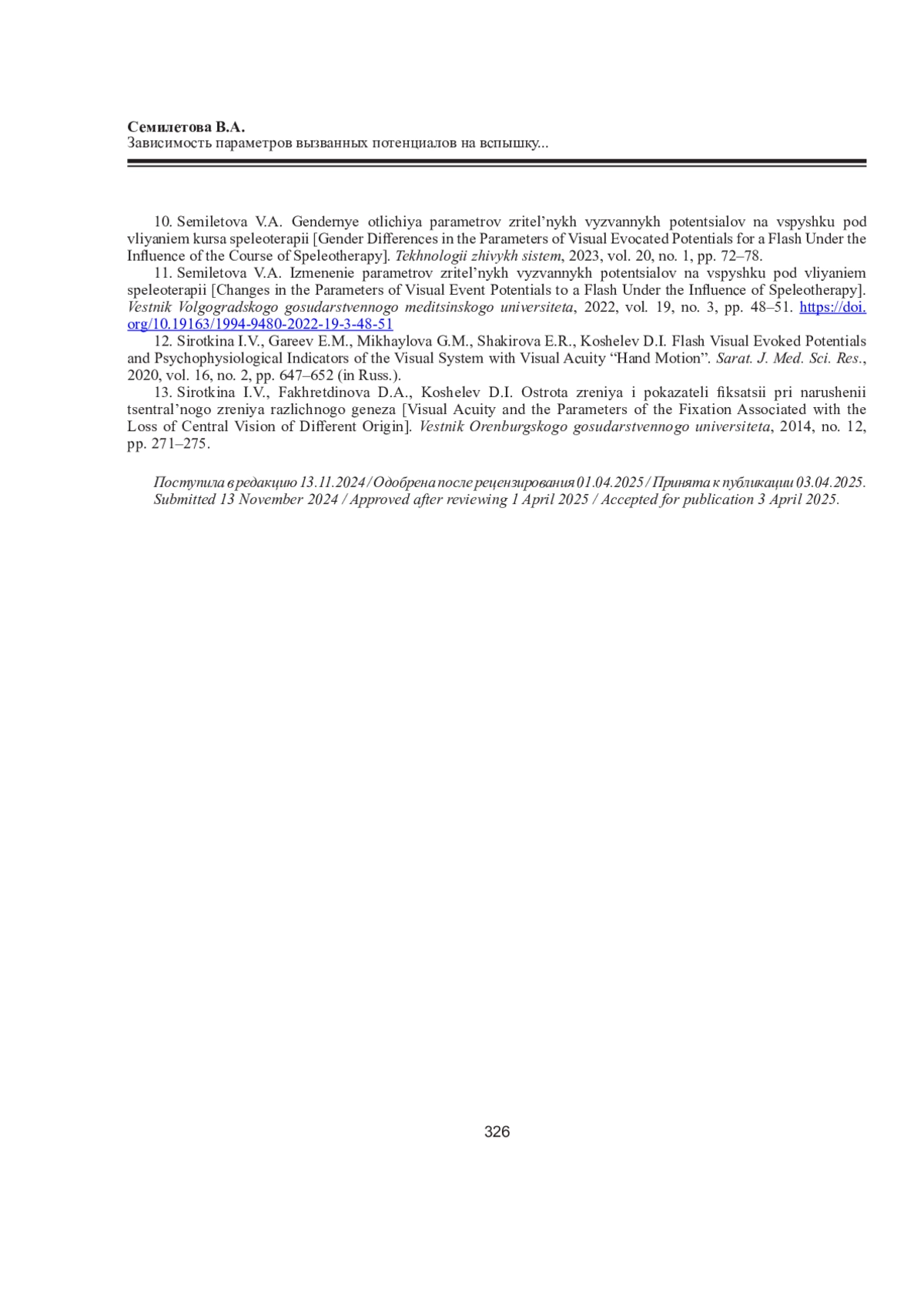 11. Семилетова В.А. Изменение параметров зрительных вызванных потенциалов на вспышку под влиянием спелеотерапии // Вестн. Волгогр. гос. мед. ун-та. 2022. Т. 19, No 3. С. 48-51. DOI: 10.19163/1994-9480-2022-19-3-48-51