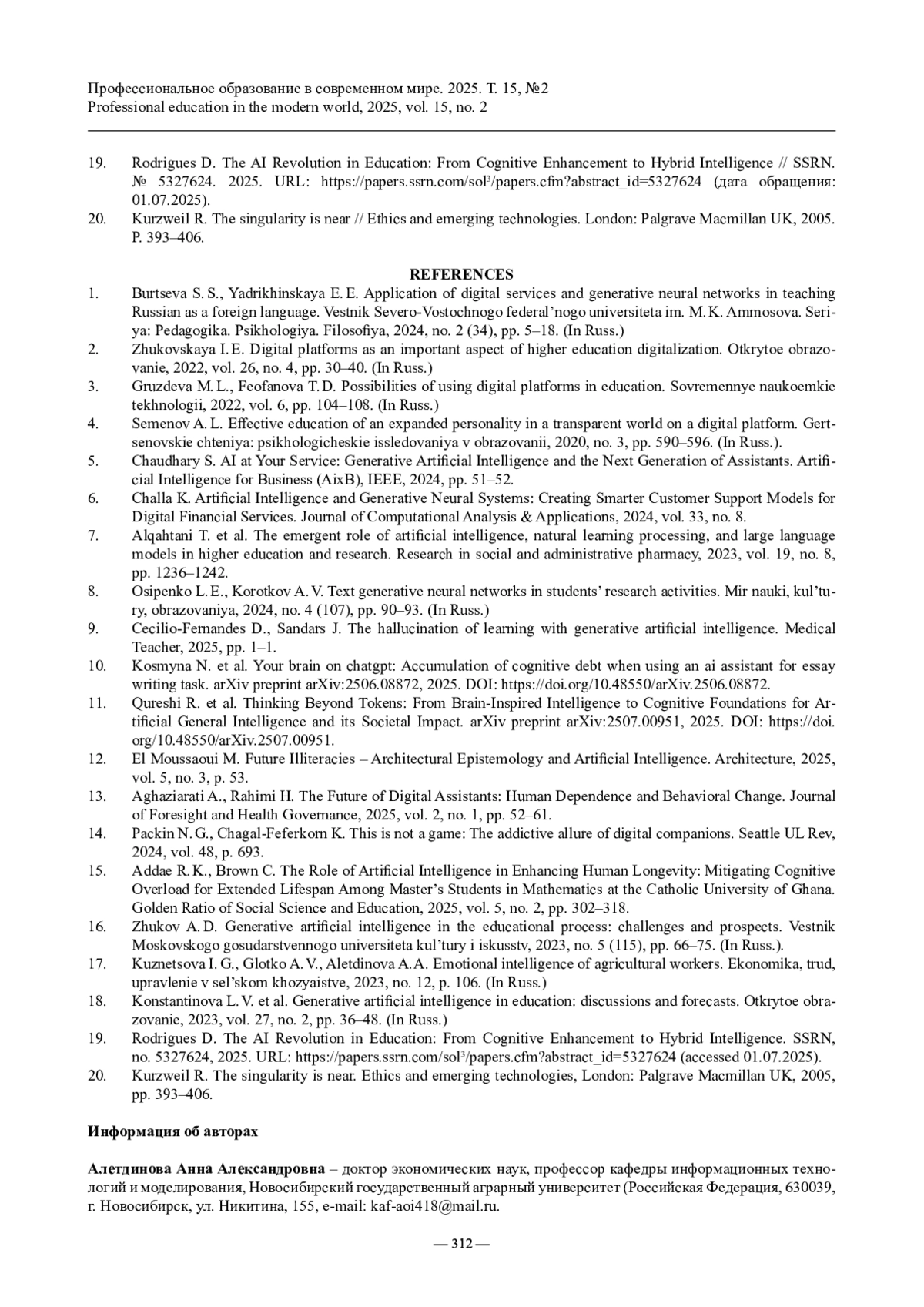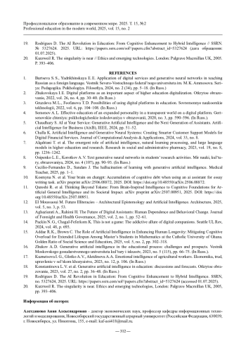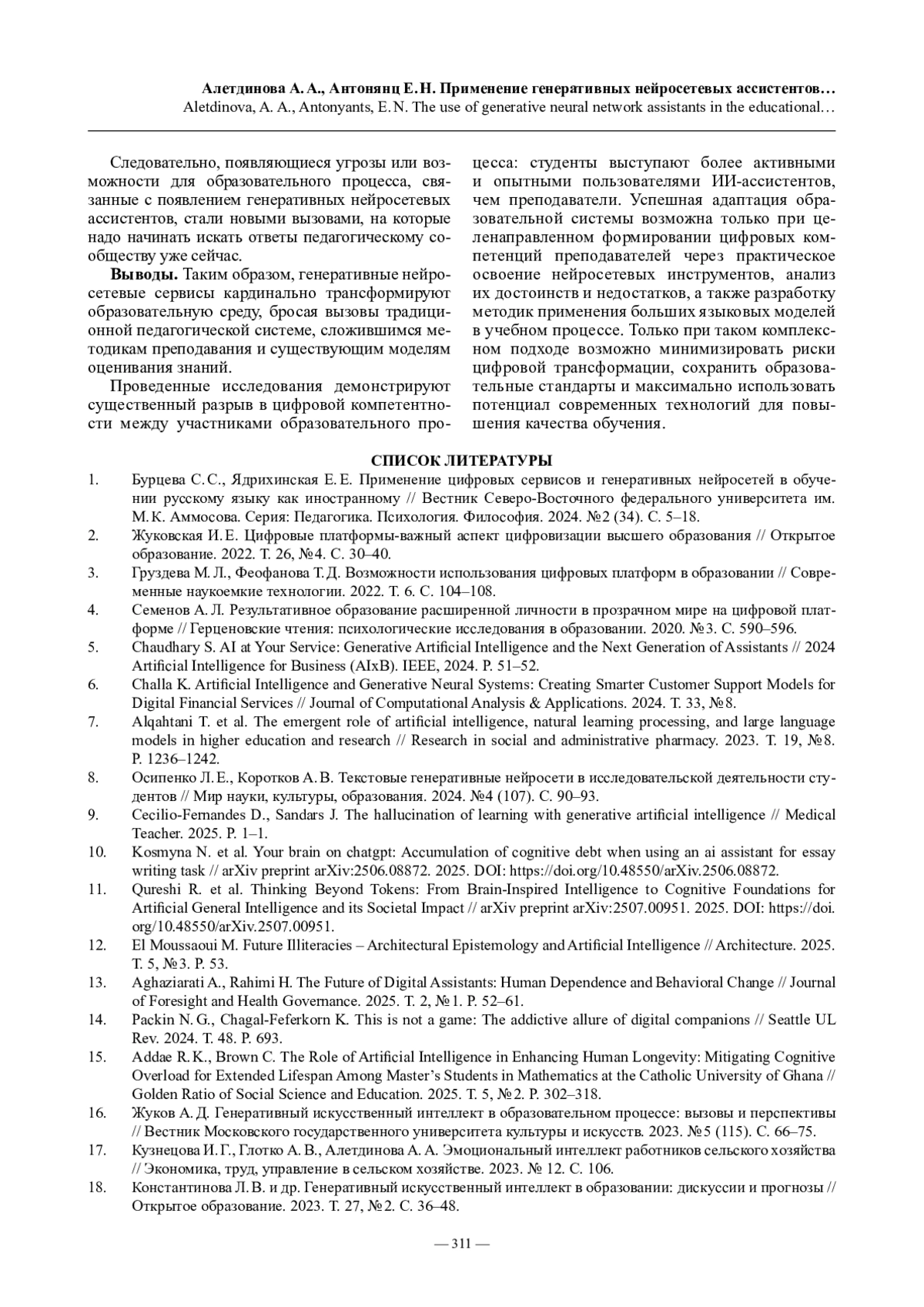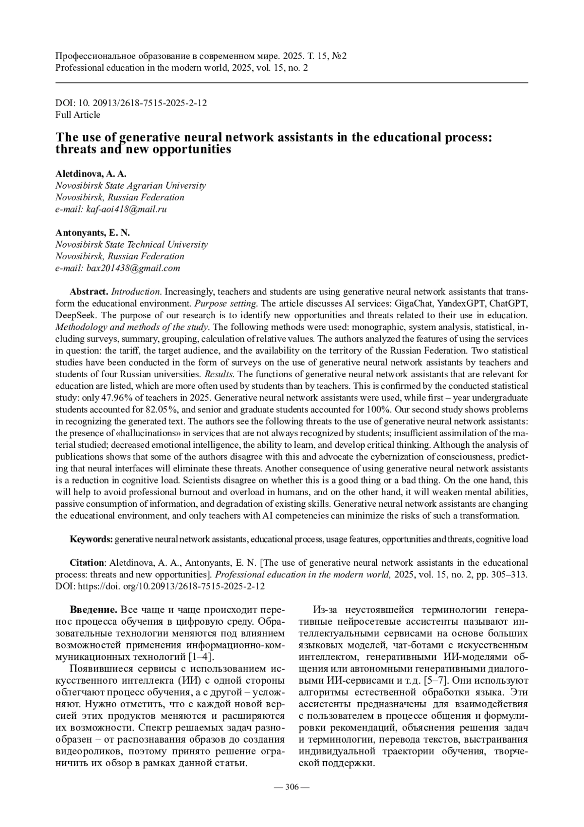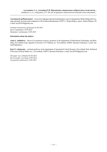 АЛЕТДИНОВА А. А., АНТОНЯНЦ Е. Н. ПРИМЕНЕНИЕ ГЕНЕРАТИВНЫХ НЕЙРОСЕТЕВЫХ АССИСТЕНТОВ В ОБРАЗОВАТЕЛЬНОМ ПРОЦЕССЕ: УГРОЗЫ И НОВЫЕ ВОЗМОЖНОСТИ // ПРОФЕССИОНАЛЬНОЕ ОБРАЗОВАНИЕ В СОВРЕМЕННОМ МИРЕ. 2025. Т. 15, № 2