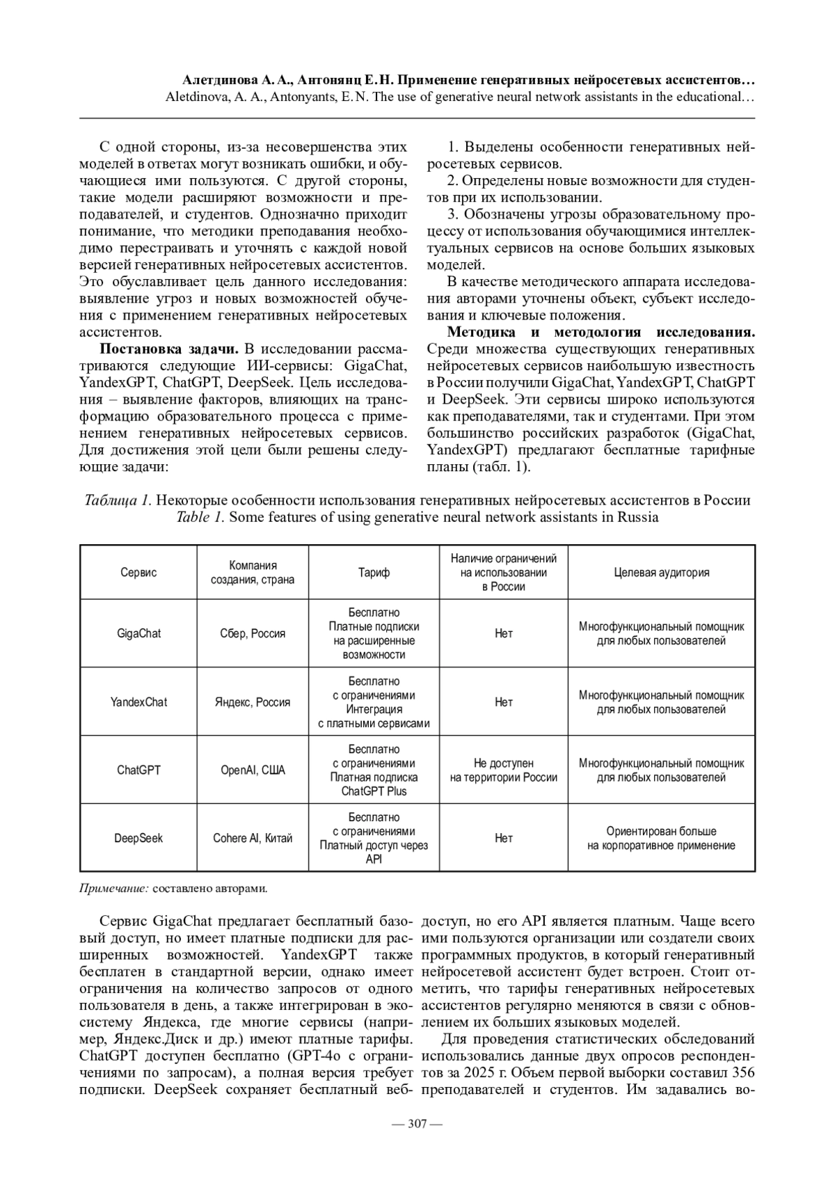 Введение. Все чаще преподаватели и студенты используют генеративные нейросетевые ассистенты, трансформирующие образовательную среду. Постановка задачи. В статье рассматриваются ИИ-сервисы: GigaChat, YandexGPT, ChatGPT, DeepSeek.
