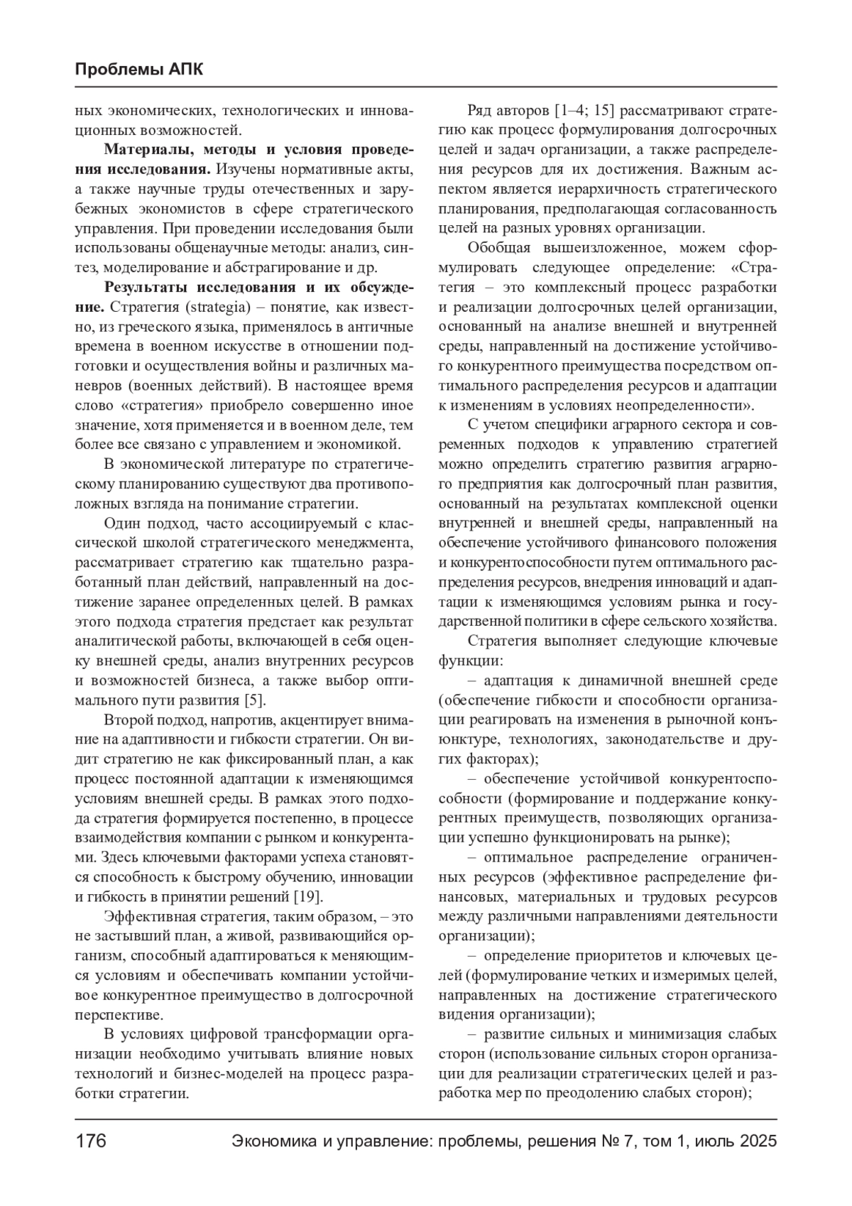 В статье рассматриваются различные классификации стратегий в системе стратегического управления с акцентом на применение в сельскохозяйственном производстве. Анализируются подходы известных исследователей, которые предлагают многоуровневую и многофакторную структуру стратегий, включающую корпоративные, конкурентные и функциональные уровни. В статье особое внимание уделяется специфике аграрного сектора, учитывающей природные условия и сезонность. Представлены классификации стратегий по различным признакам: уровню, направлению, срокам, типу ресурсов и целям, а также с учетом современных экономических, технологических и инновационных возможностей (инновационность, диверсификация, географический охват и степень интеграции). Подчеркивается необходимость комплексного анализа внутренней и внешней среды предприятия для выбора оптимальных стратегий с учетом отраслевой специфики и финансовой устойчивости. Сделан вывод, что предложенные классификации способствуют формированию системного подхода к стратегическому планированию в сельском хозяйстве и повышению эффективности управления аграрными предприятиями в условиях динамично меняющейся экономической среды.