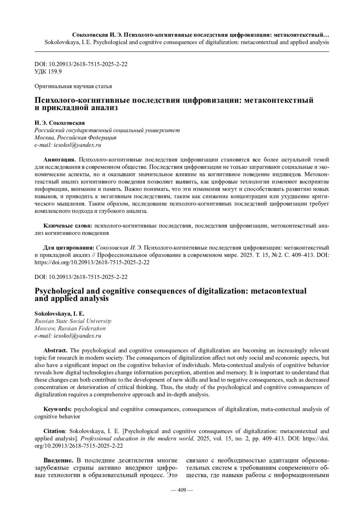 Психолого-когнитивные последствия цифровизации становятся все более актуальной темой для исследования в современном обществе. Последствия цифровизации не только затрагивают социальные и экономические аспекты, но и оказывают значительное влияние на когнитивное поведение индивидов. Метоконтекстный анализ когнитивного поведения позволяет выявить, как цифровые технологии изменяют восприятие информации, внимание и память. Важно понимать, что эти изменения могут и способствовать развитию новых навыков, и приводить к негативным последствиям, таким как снижение концентрации или ухудшение критического мышления. Таким образом, исследование психолого-когнитивных последствий цифровизации требует комплексного подхода и глубокого анализа.