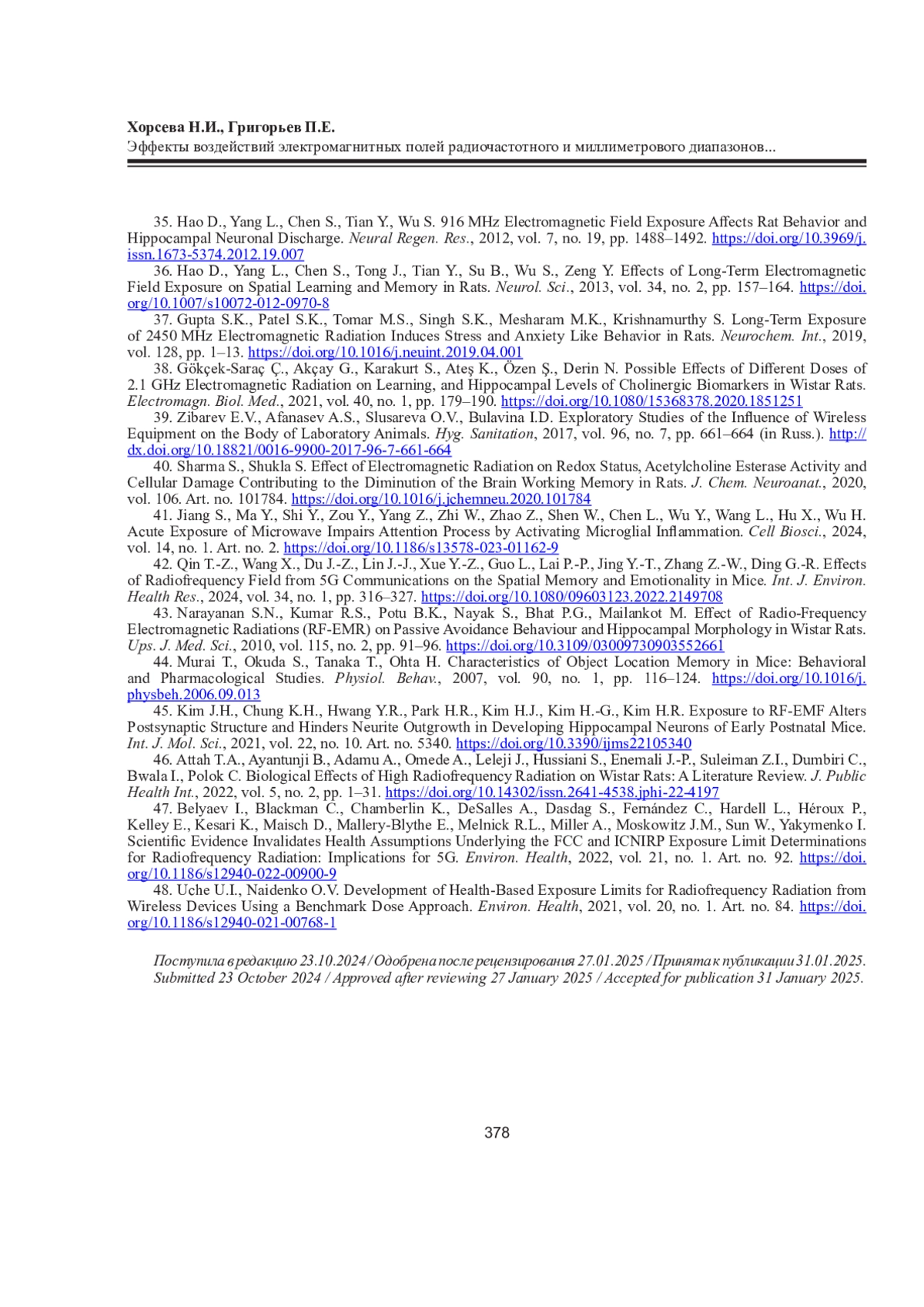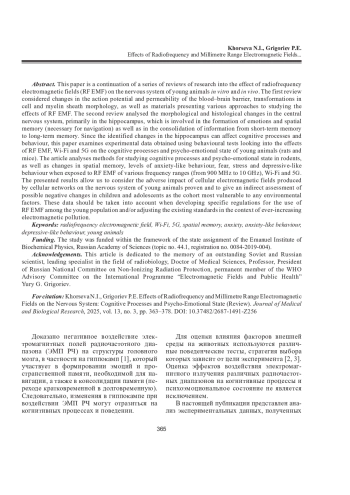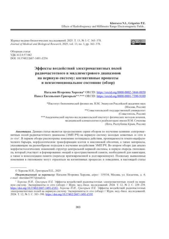 1. Хорсева Н.И., Григорьев П.Е. Эффекты воздействий радиочастотных электромагнитных полей на нервную систему. Эксперименты in vivo (обзор) // Журн. мед.-биол. исслед. 2024. Т. 12, No 3. С. 383-398. DOI: 10.37482/2687-1491-Z195