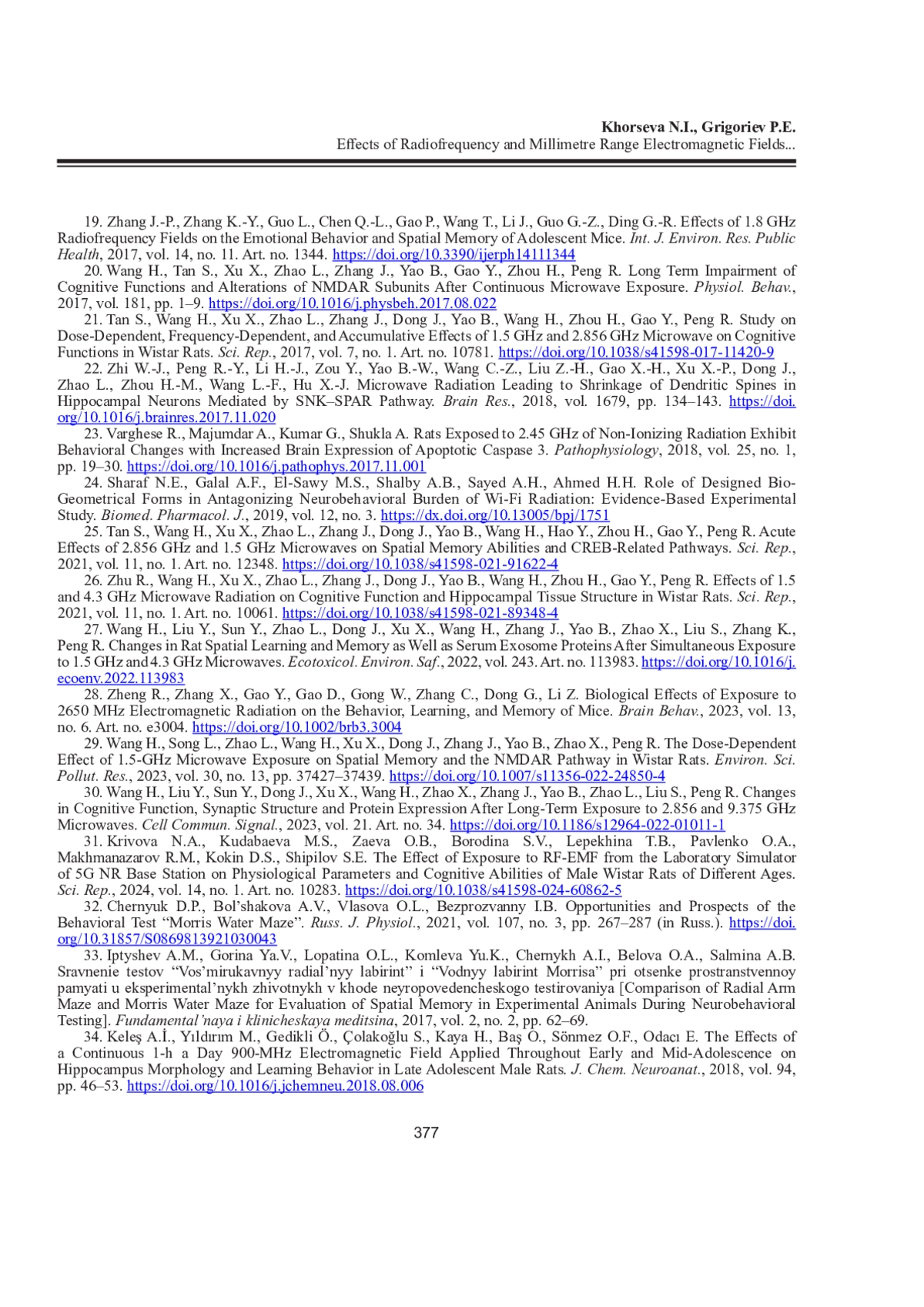 23. Varghese R., Majumdar A., Kumar G., Shukla A. Rats Exposed to 2.45 GHz of Non-Ionizing Radiation Exhibit Behavioral Changes with Increased Brain Expression of Apoptotic Caspase 3 // Pathophysiology. 2018. Vol. 25, No 1. P. 19-30. DOI: 10.1016/j.pathophys.2017.11.001