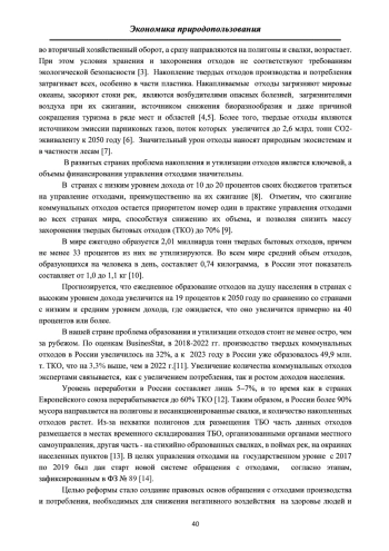 По прогнозам Всемирного банка количество отходов к 2050 году превзойдет рост населения более чем вдвое [1]. Несмотря на пристальное внимание к проблеме формирования и накопления отходов, внедрения инноваций и новых технологий утилизации отходов проблема не теряет своей актуальности. В настоящее время устойчивое развитие формируется по принципу использования меньшего количества ресурсов на единицу продукции, а концепция круговой экономики разрабатывается как основополагающий компонент «зеленой экономики» [2].