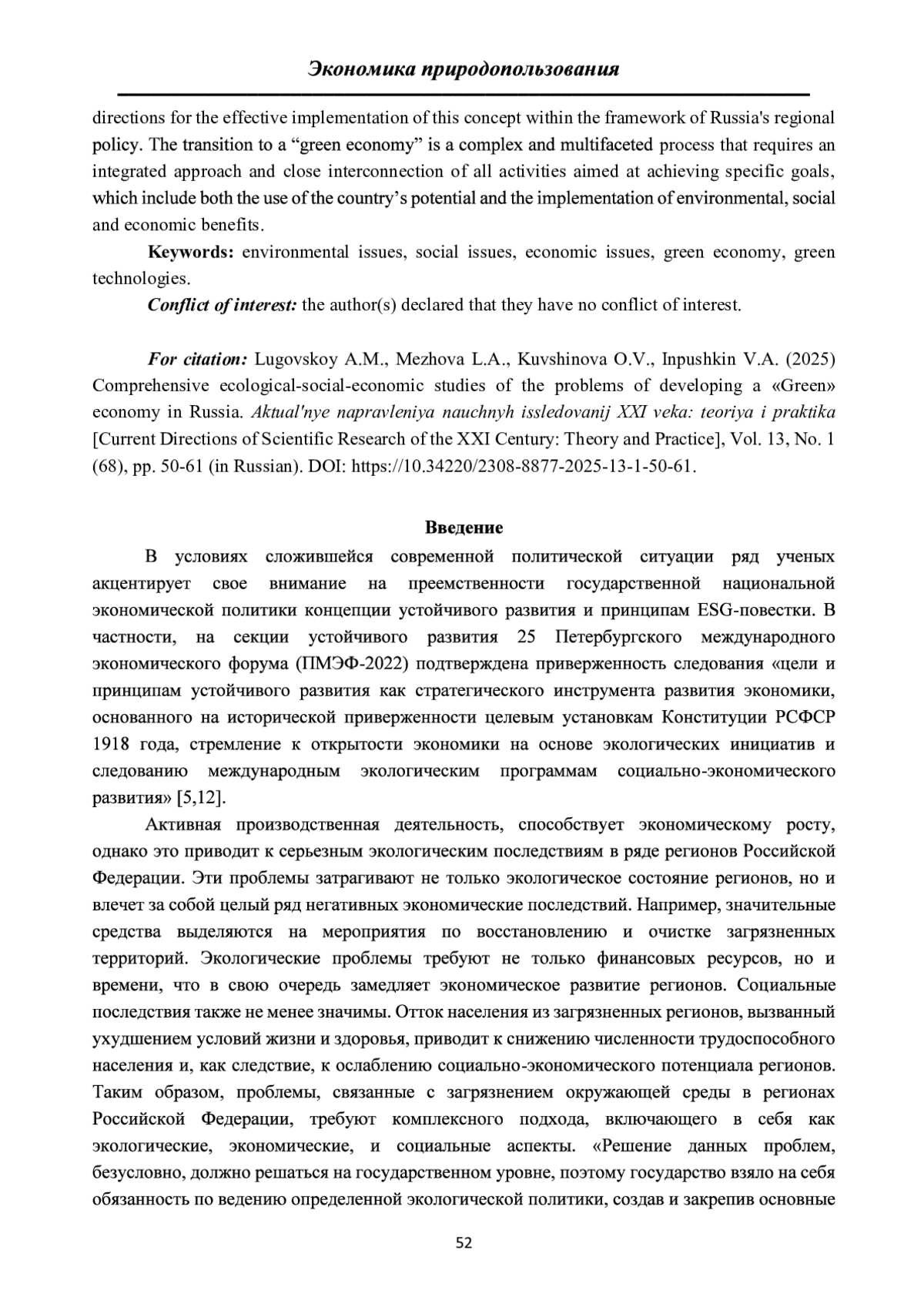 20. Zemzyulina V.Yu. On the relevance of the green economy for Russian enterprises / V.Yu. Zemzyulina, N.R. Kelchevskaya // Russian regions in the focus of change: Collection of reports of the XVII International Conference, Yekaterinburg, November 17-19, 2022. - Yekaterinburg: OOO Izdatelskiy Dom Azhur, 2023. - P. 283-286.