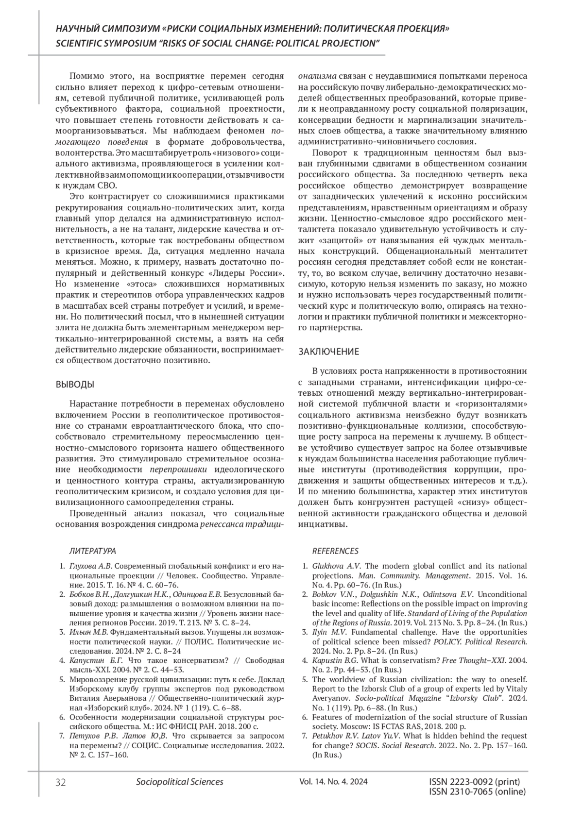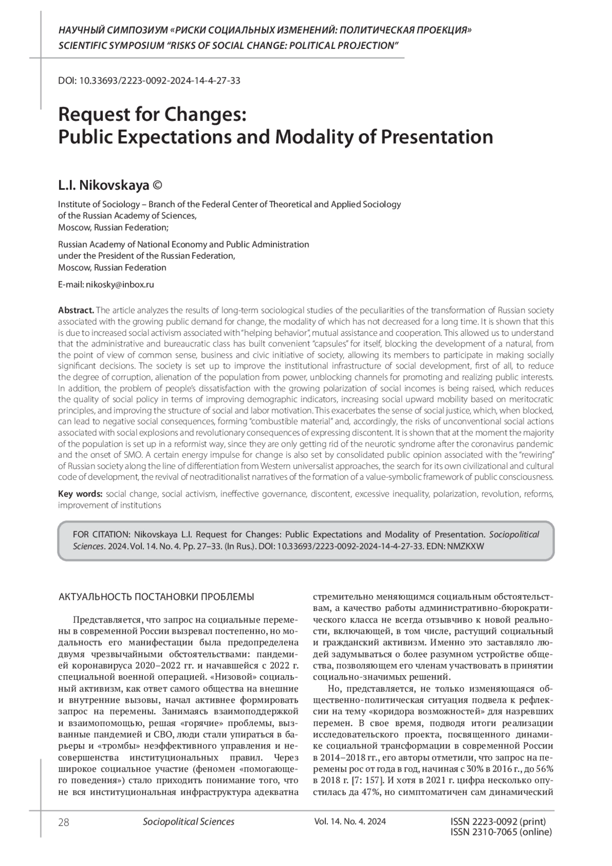 В статье анализируются результаты многолетних социологических исследований особенностей трансформации российского общества, связанные с растущим общественным запросом на перемены, модальность которого не снижается длительное время. Показано, что это обусловлено усилением социального активизма, связанного с «помогающим поведением», взаимопомощью и кооперацией. Это позволило прийти к пониманию, что административно-бюрократический класс выстроил для себя удобные «капсулы», блокирующие развитие естественной, с точки зрения здравого смысла, деловой и гражданской инициативы общества, позволяющей его членам участвовать в принятии социально-значимых решений. Общество настроено на оздоровление институциональной инфраструктуры общественного развития, прежде всего, снижение степени коррупции, отчуждения населения от власти, разблокировки каналов продвижения и реализации общественных интересов. Помимо этого, поднимается проблема недовольства людей растущей поляризацией социальных доходов, что снижает качество проводимой социальной политики в части улучшения демографических показателей, роста социальной восходящей мобильности на основе меритократических принципов, улучшения структуры социально-трудовой мотивации. Это обостряет чувство социальной справедливости, которое, будучи заблокированным, может привести к негативным социальным последствиям, формируя «горючий материал» и, соответственно, риски неконвенциональных социальных действий, связанных с социальными взрывами и революционными последствиями выражения недовольства Показано, что в настоящий момент большинство населения настроено на реформисткий лад, поскольку только освобождается от невротического синдрома после пандэмии короновируса и начала СВО. Определенный энергетический импульс к переменам задается также консолидированным общественным мнением, связанным с «перепрошивкой» российского общества по линии дифференциации от западных универсалистких подходов, поиска своего цивилизационно- культурного кода развития, возрождения неотрадиционалистских нарративов формирования ценностно-символического каркаса общественного сознания.