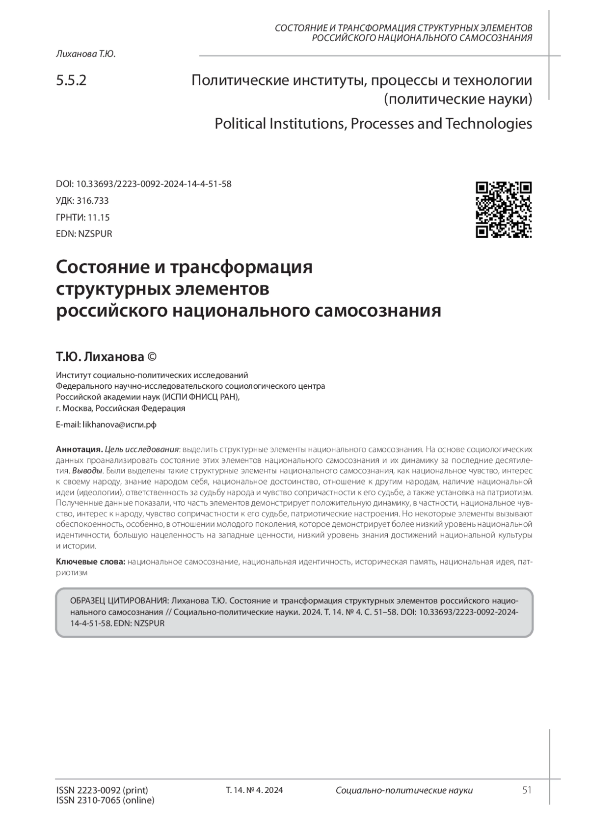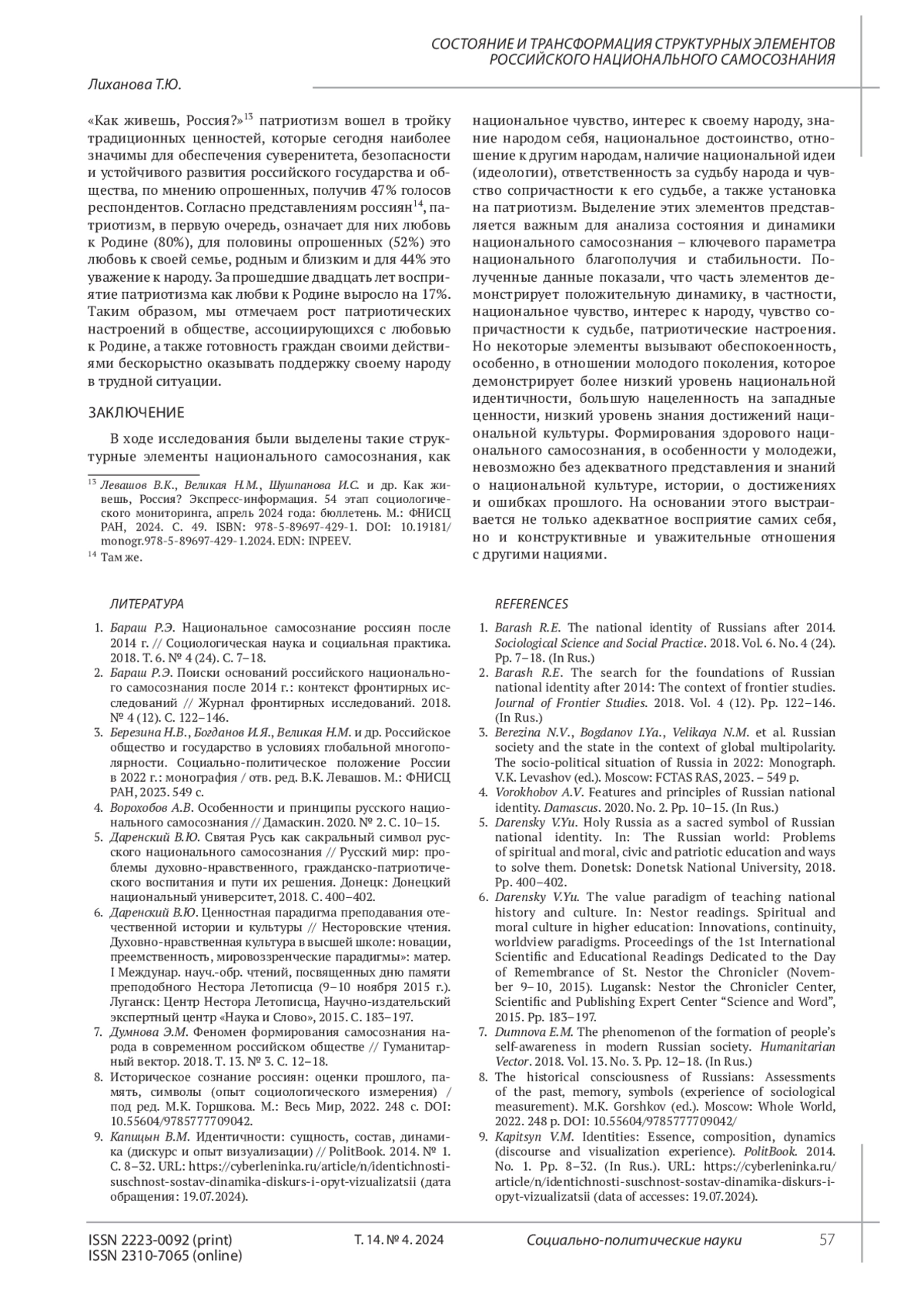 1. Бараш Р.Э. Национальное самосознание россиян после 2014 г. // Социологическая наука и социальная практика. 2018. Т. 6. № 4 (24). С. 7-18. EDN: YQJUFN