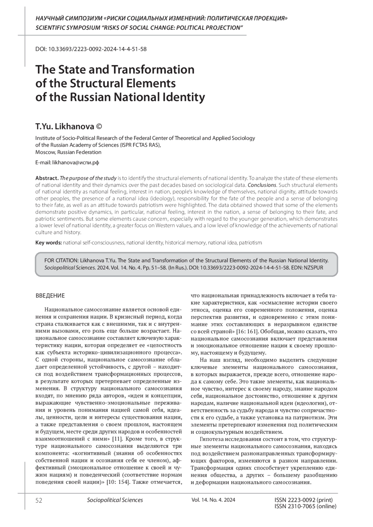 Цель исследования: выделить структурные элементы национального самосознания. На основе социологических данных проанализировать состояние этих элементов национального самосознания и их динамику за последние десятилетия. Выводы. Были выделены такие структурные элементы национального самосознания, как национальное чувство, интерес к своему народу, знание народом себя, национальное достоинство, отношение к другим народам, наличие национальной идеи (идеологии), ответственность за судьбу народа и чувство сопричастности к его судьбе, а также установка на патриотизм. Полученные данные показали, что часть элементов демонстрирует положительную динамику, в частности, национальное чувство, интерес к народу, чувство сопричастности к его судьбе, патриотические настроения. Но некоторые элементы вызывают обеспокоенность, особенно, в отношении молодого поколения, которое демонстрирует более низкий уровень национальной идентичности, большую нацеленность на западные ценности, низкий уровень знания достижений национальной культуры и истории.