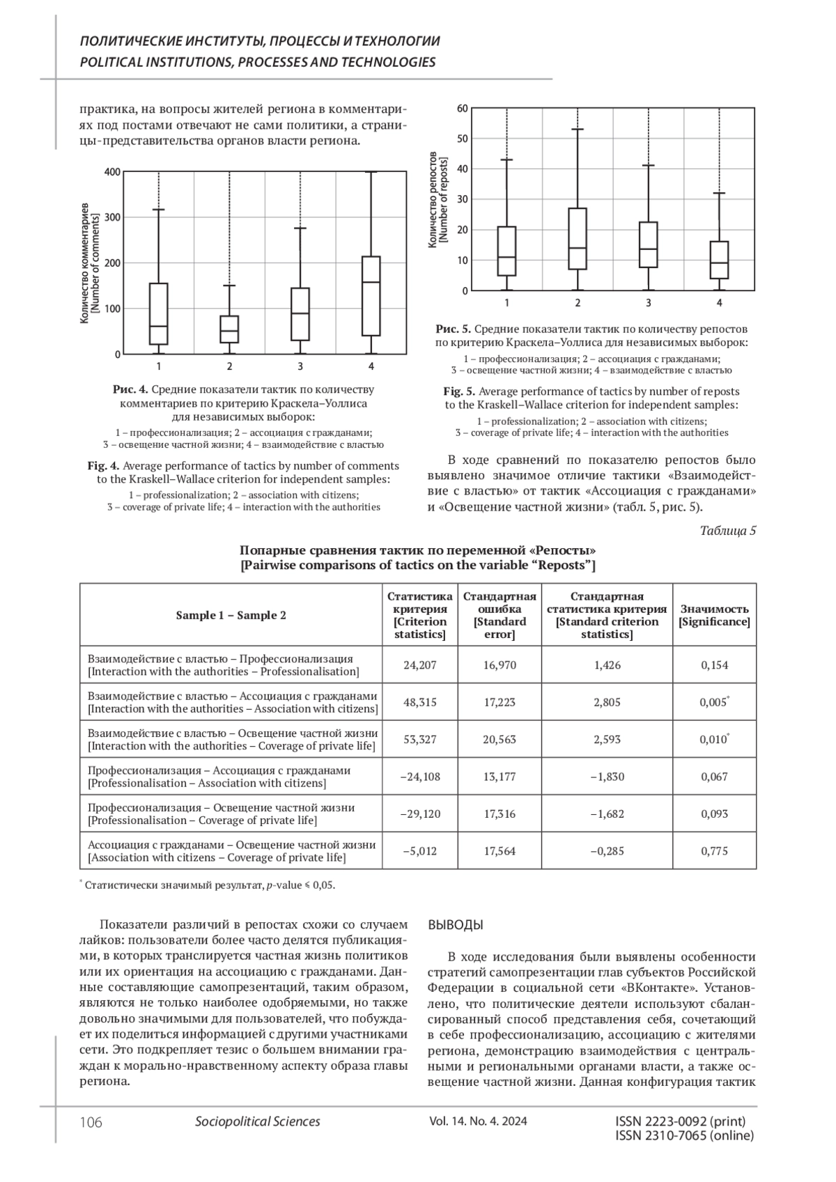 Наиболее часто в самопрезентациях глав регионов используются тактики профессионализации и ассоциации с гражданами. Это объясняется тем, что они напрямую выражают две необходимых составляющих образа высшего должностного лица субъекта. Во-первых, это деятельностный аспект, демонстрирующий активную работу на благо региона, и, во-вторых, морально-нравственная составляющая, транслирующая открытость к жителям. Публикации, демонстрирующие взаимодействие с властью и частную жизнь политиков, размещаются намного реже и носят вспомогательный характер. Первая группа публикаций призвана обозначить роль связующего звена главы региона в структуре власти, вторая – придать самопрезентации неформальный характер.