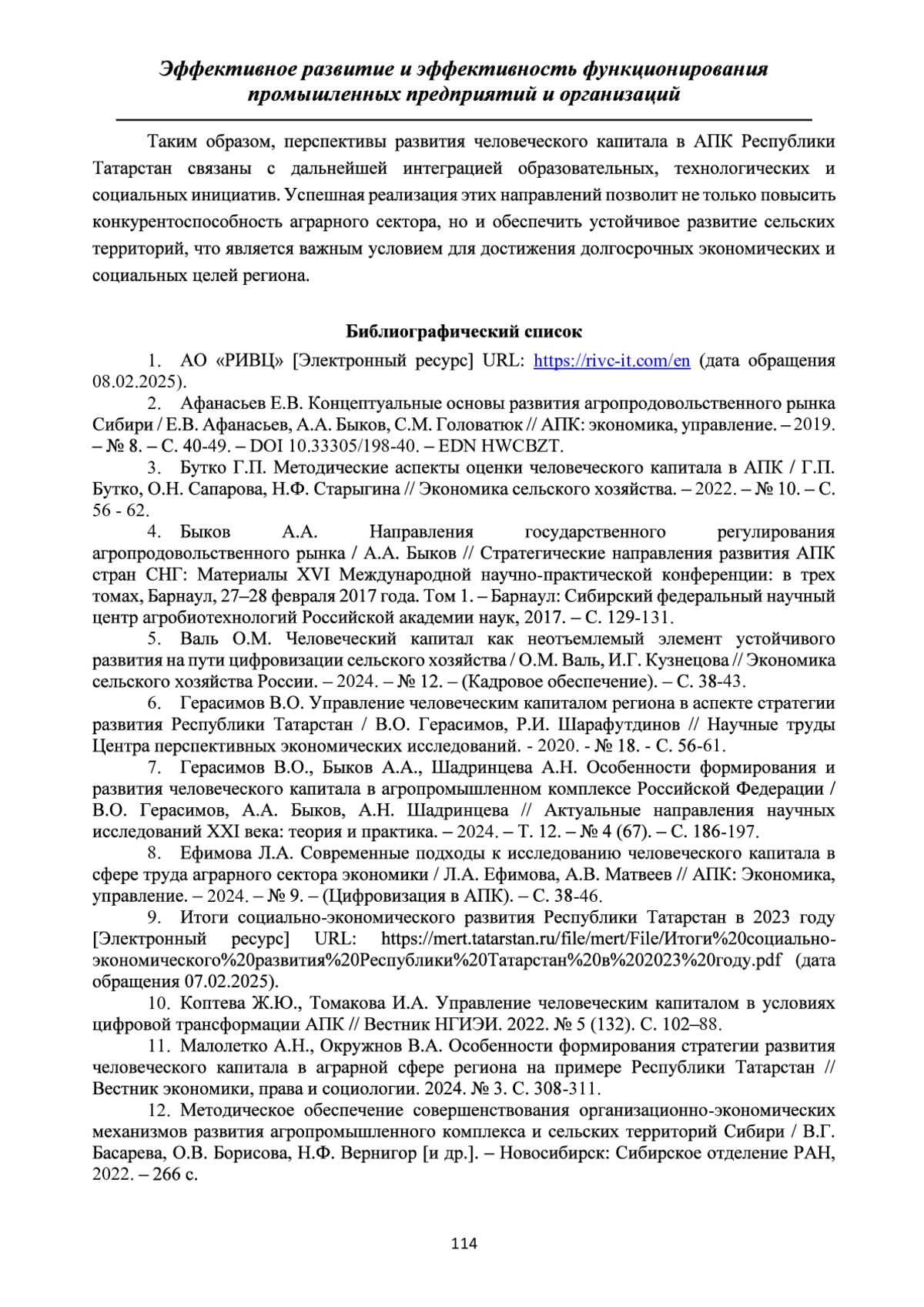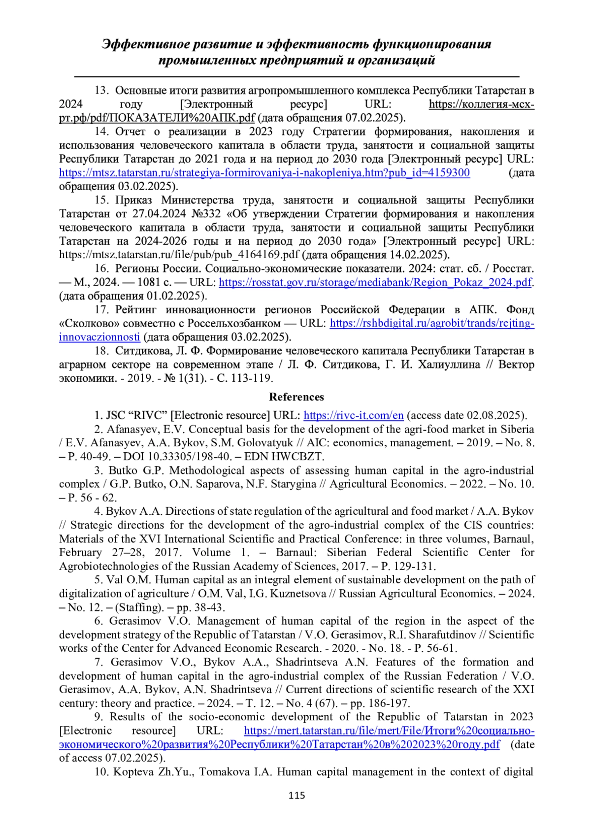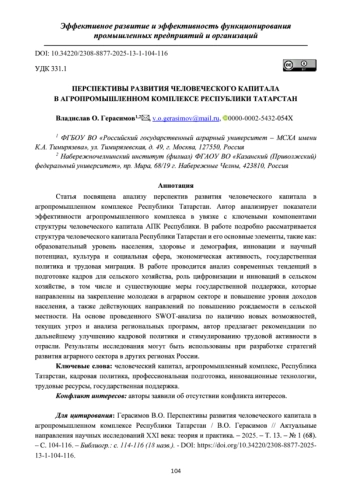 Статья: ПЕРСПЕКТИВЫ РАЗВИТИЯ ЧЕЛОВЕЧЕСКОГО КАПИТАЛА В АГРОПРОМЫШЛЕННОМ КОМПЛЕКСЕ РЕСПУБЛИКИ ТАТАРСТАН (2025)