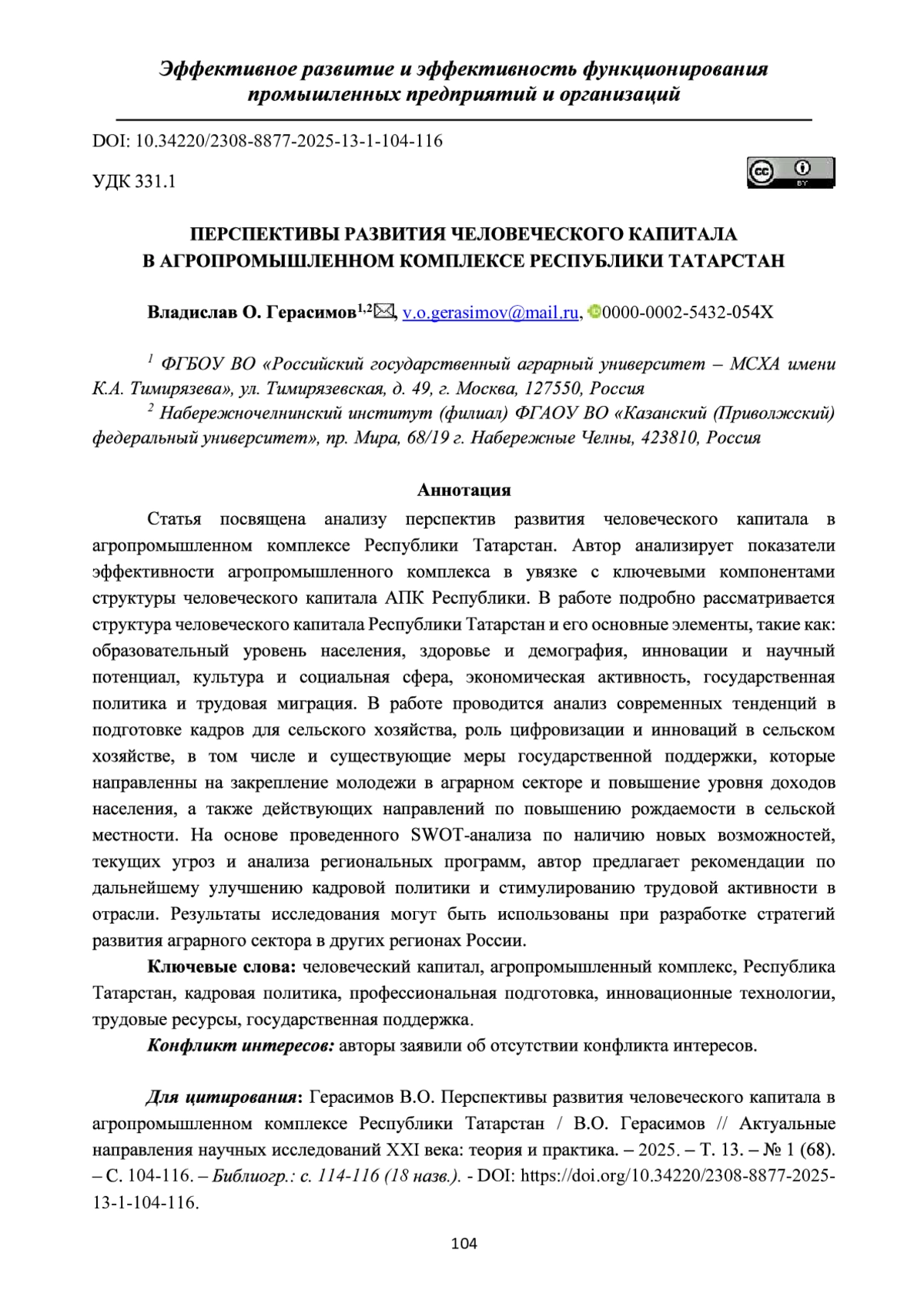 ГЕРАСИМОВ В. О. ПЕРСПЕКТИВЫ РАЗВИТИЯ ЧЕЛОВЕЧЕСКОГО КАПИТАЛА В АГРОПРОМЫШЛЕННОМ КОМПЛЕКСЕ РЕСПУБЛИКИ ТАТАРСТАН // АКТУАЛЬНЫЕ НАПРАВЛЕНИЯ НАУЧНЫХ ИССЛЕДОВАНИЙ XXI ВЕКА: ТЕОРИЯ И ПРАКТИКА. 2025. Т. 13 № 1 (68)