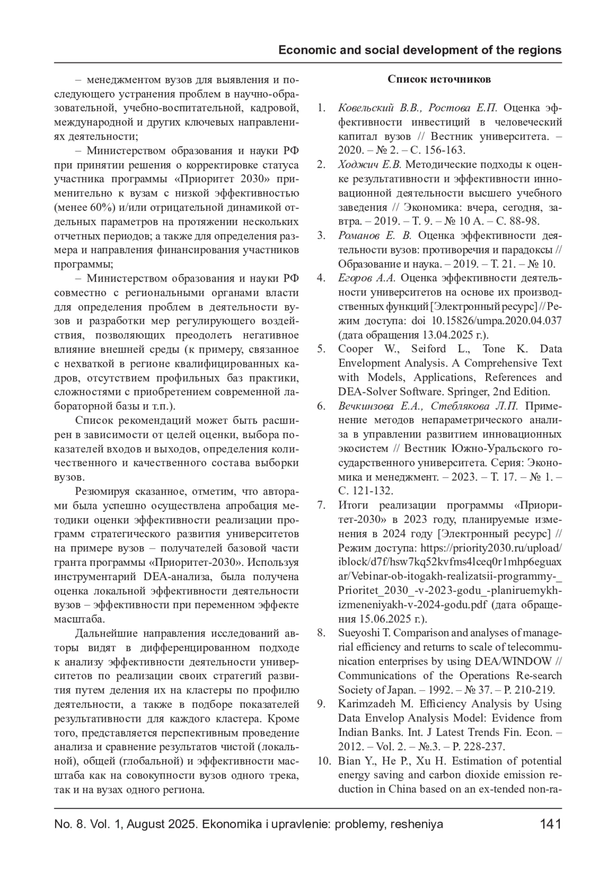 4. Егоров А.А. Оценка эффективности деятельности университетов на основе их производственных функций [Электронный ресурс] // Режим доступа: 10.15826/umpa.2020.04.037 (дата обращения 13.04.2025 г.). DOI: 10.15826/umpa.2020.04.037(