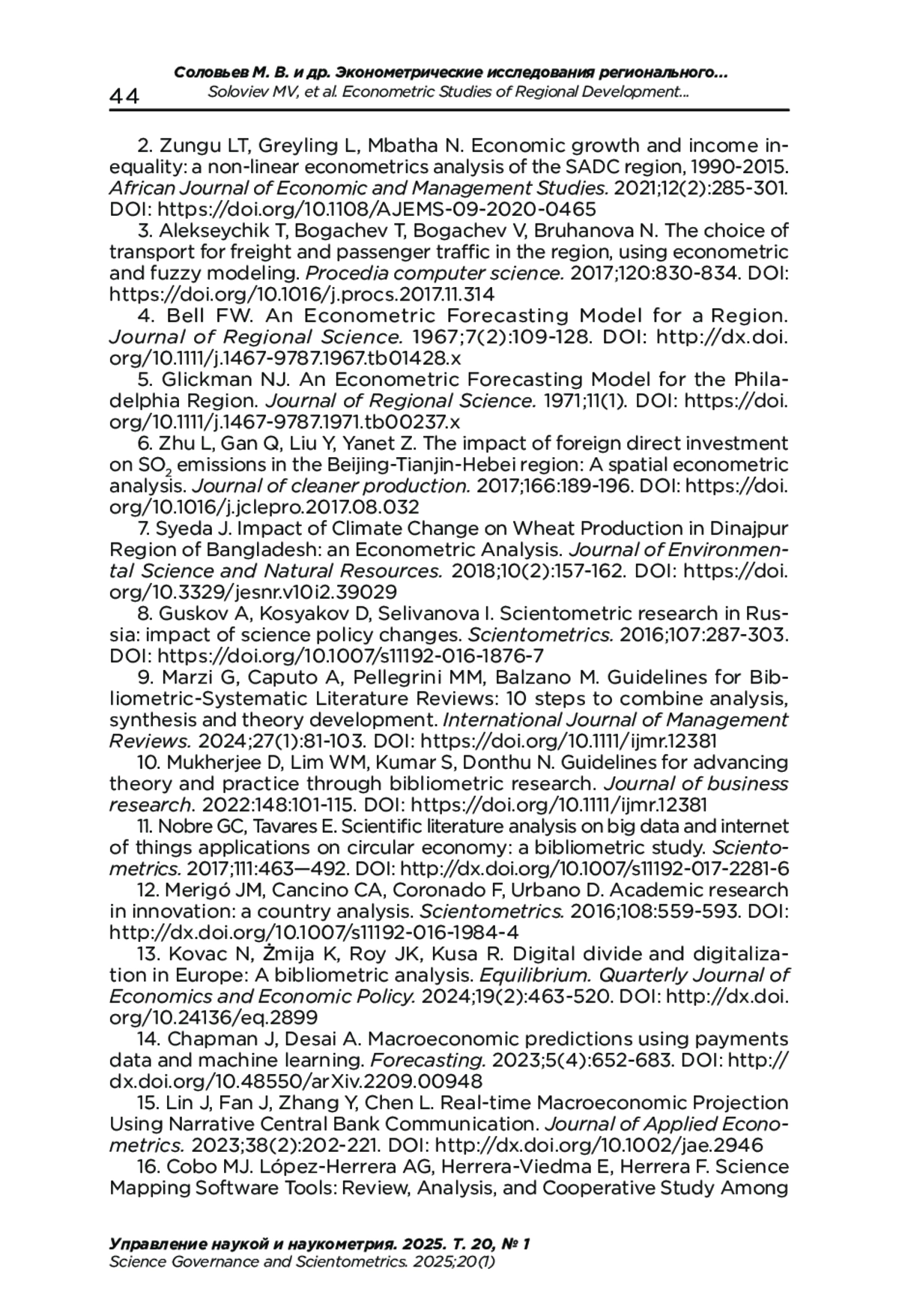 Введение. Для проведения современных научных исследований необходимо применять системный подход к анализу структуры, исследованию закономерностей научного знания. Это делает наукометрию важным инструментом в работе ученых и исследователей. Одним из ключевых направлений научных исследований в рассматриваемой области является изучение и разработка эконометрических методов моделирования и последующее их использование для прогнозирования регионального экономического развития. Для проведения исследований такого рода применяются библиометрические методы, включающие в себя анализ цитируемости, индексов научного влияния и картирование науки. Данные методы дают возможность определить ключевые научные школы, выявить исследовательские тренды и оценить уровень международного сотрудничества.