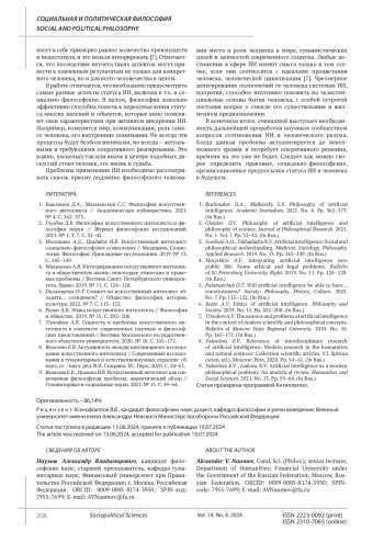 1. Башмаков Д.А., Мальковский С.С. Философия искусственного интеллекта // Академическая публицистика. 2021. № 4. С. 362-373. EDN: GTESMB