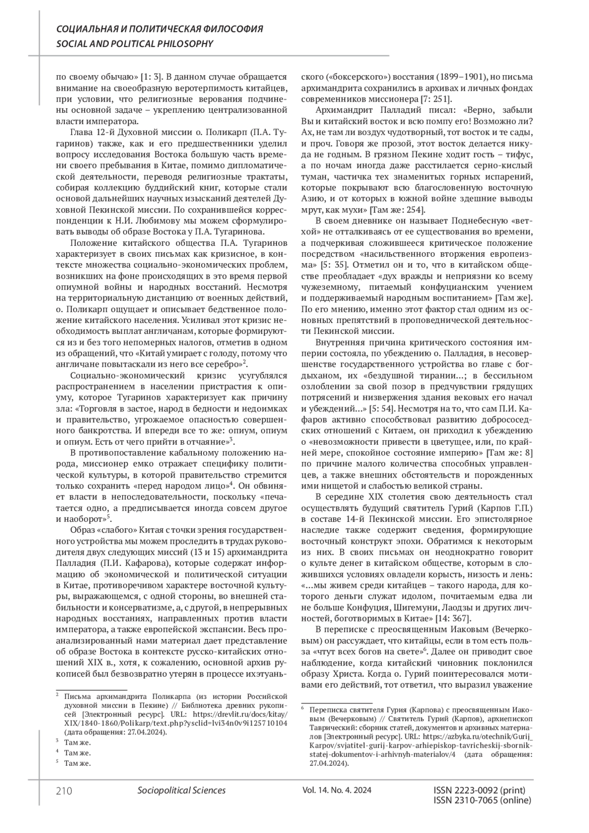 В настоящее время вновь становится актуальным вопрос изучения культурной специфики стран Востока, поскольку развитие сотрудничества между нашей страной и государствами Азии невозможно без понимания особенностей каждой из них. Именно сейчас, в условиях формирования многополярного мира и интенсификации сотрудничества России со странами Aзии (в частности, с Китаем), данная проблема приобретает особую значимость. Поэтому нам следует обратиться к истокам осмысления этой проблематики – опыту деятельности Русской Духовной миссии, которая не ограничивалась только духовной сферой, поскольку в ее основе лежало формирование политических, экономических и социальных связей. Для этого мы обратимся к образу Востока, сформированному в ходе развития русской православной миссии.