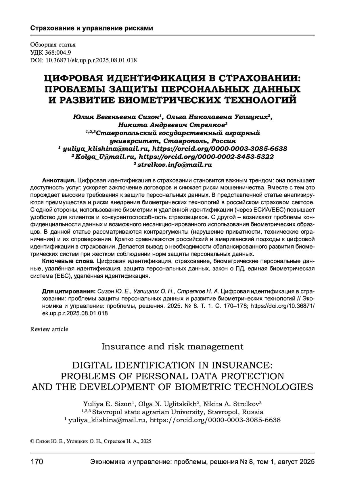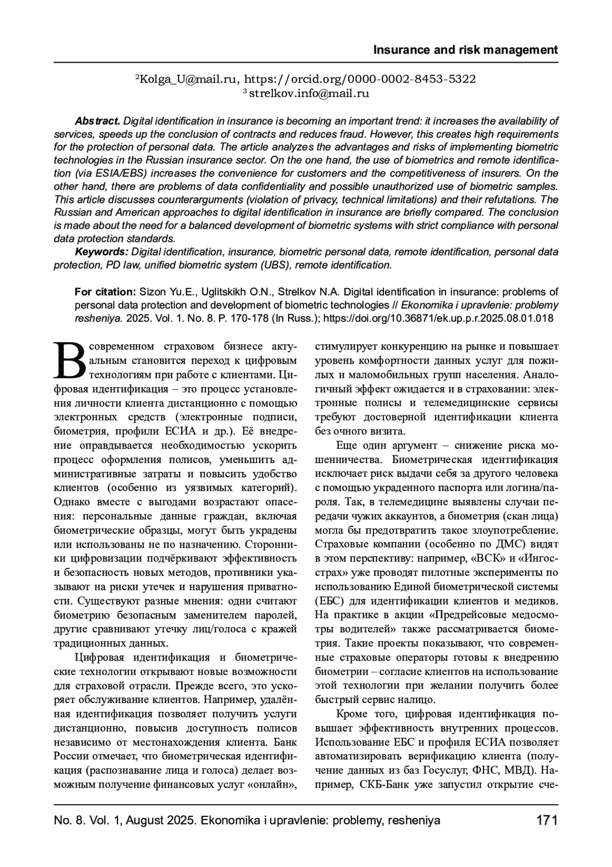 Цифровая идентификация в страховании становится важным трендом: она повышает доступность услуг, ускоряет заключение договоров и снижает риски мошенничества. Вместе с тем это порождает высокие требования к защите персональных данных. В представленной статье анализируются преимущества и риски внедрения биометрических технологий в российском страховом секторе. С одной стороны, использование биометрии и удалённой идентификации (через ЕСИА/ЕБС) повышает удобство для клиентов и конкурентоспособность страховщиков. С другой - возникают проблемы конфиденциальности данных и возможного несанкционированного использования биометрических образцов. В данной статье рассматриваются контраргументы (нарушение приватности, технические ограничения) и их опровержения. Кратко сравниваются российский и американский подходы к цифровой идентификации в страховании. Делается вывод о необходимости сбалансированного развития биометрических систем при жёстком соблюдении норм защиты персональных данных.