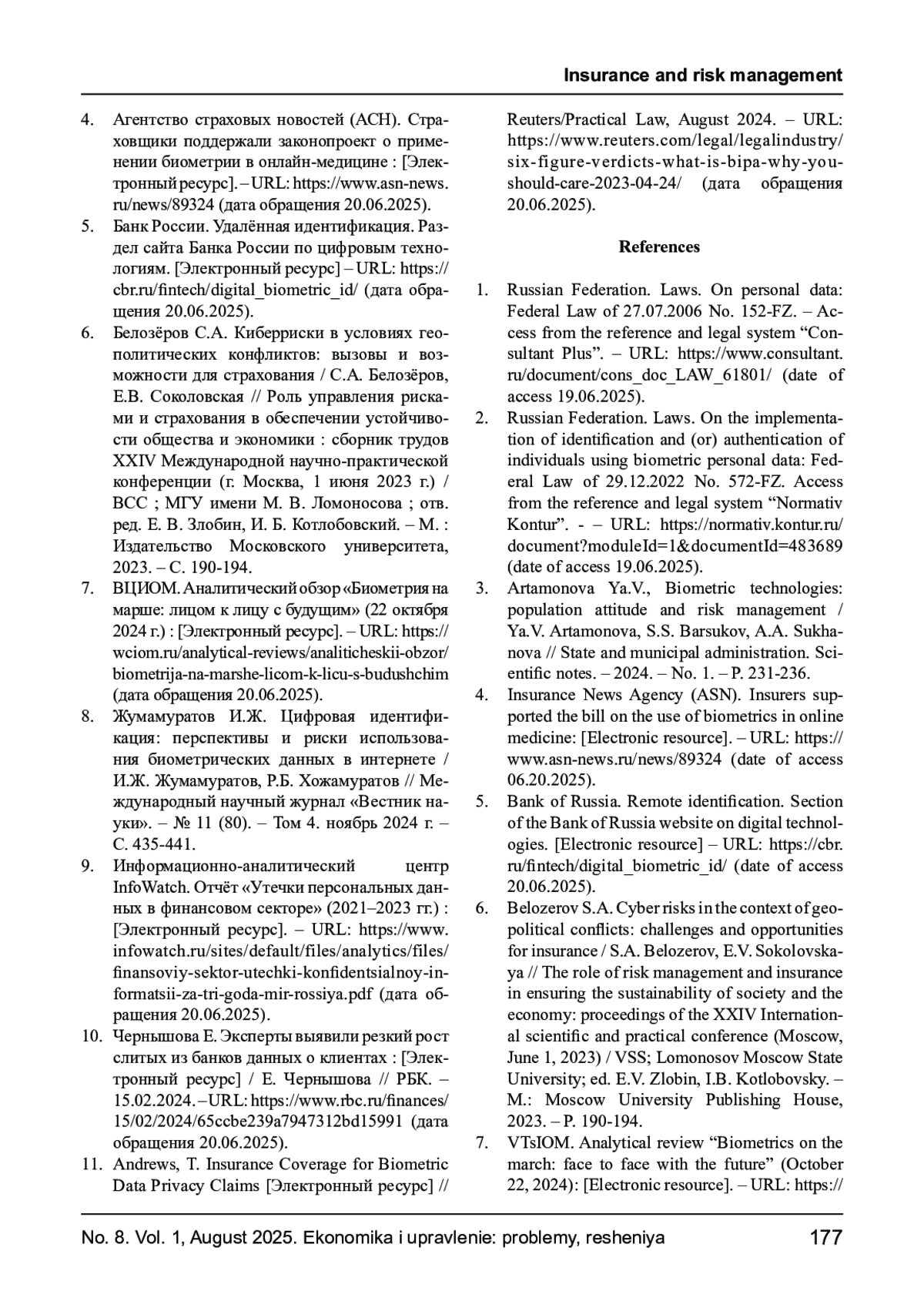 8. Жумамуратов И.Ж. Цифровая идентификация: перспективы и риски использования биометрических данных в интернете / И.Ж. Жумамуратов, Р.Б. Хожамуратов // Международный научный журнал “Вестник науки”. - № 11 (80). - Том 4. ноябрь 2024 г. - С. 435-441. EDN: ZHVXQZ