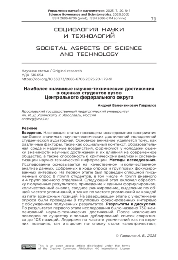 Введение. Настоящая статья посвящена исследованию восприятия наиболее значимых научно-технических достижений молодежной студенческой аудиторией. Основное внимание уделяется тому, как различные факторы, такие как социальный контекст, образовательная среда и медийные воздействия, формируют у молодежи оценку значимости научных достижений и их влияния на современное общество, а также способность к критическому анализу и систематизации научно-технической информации.