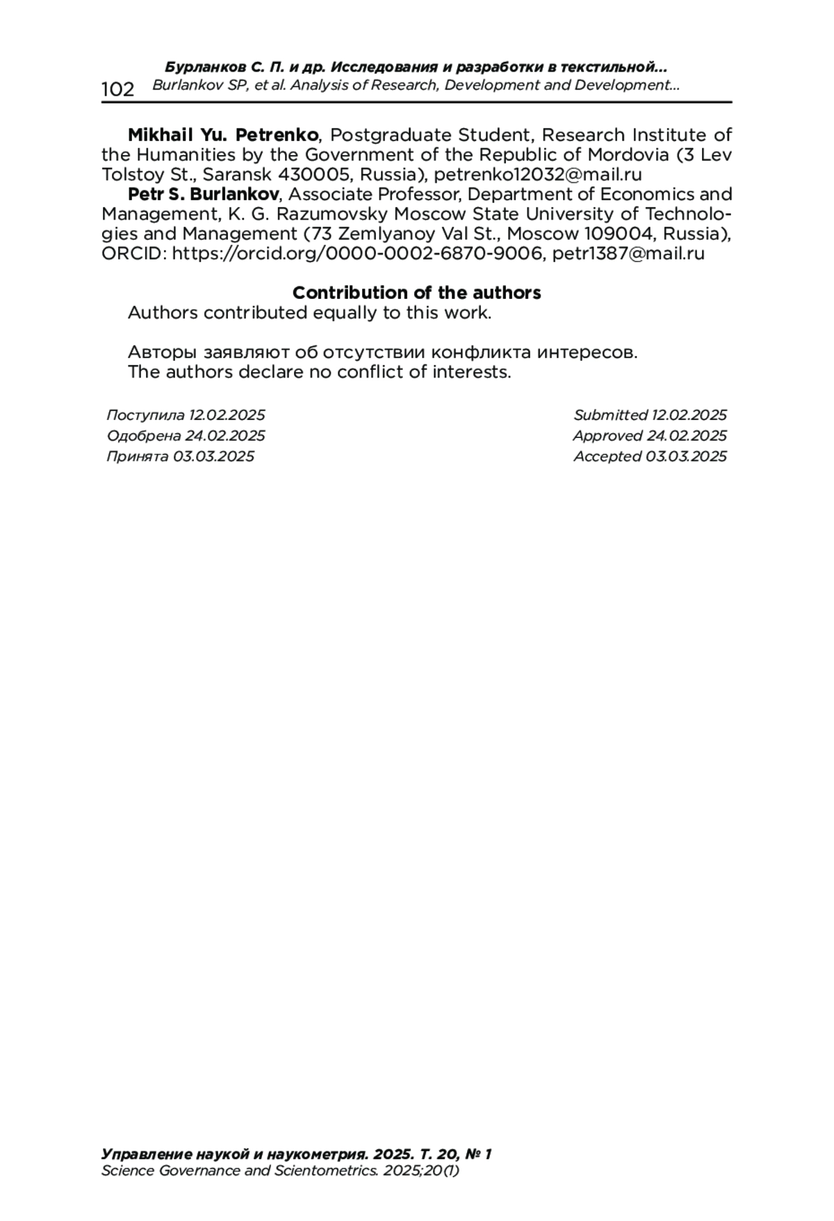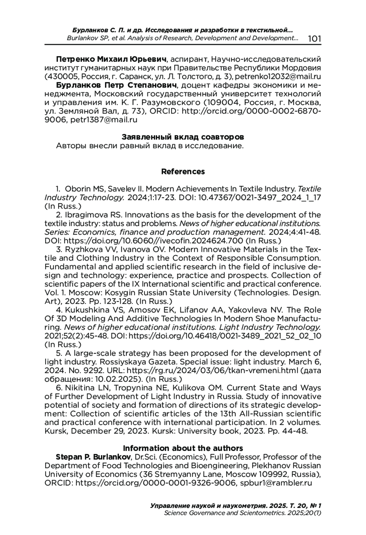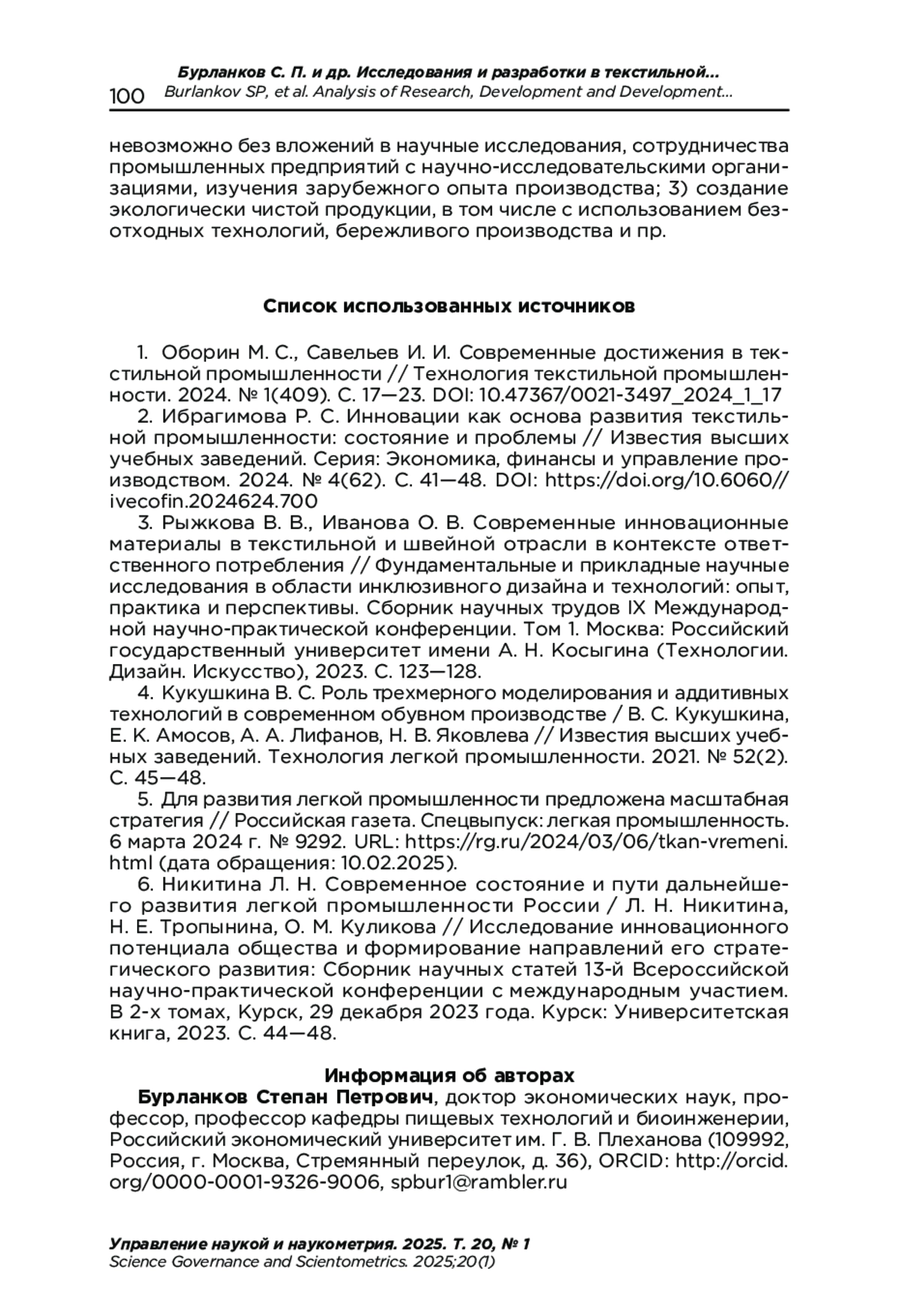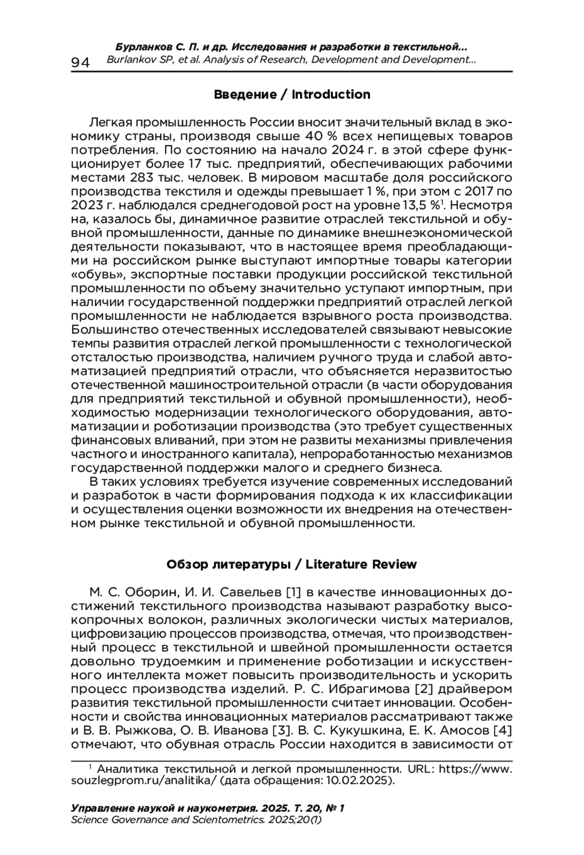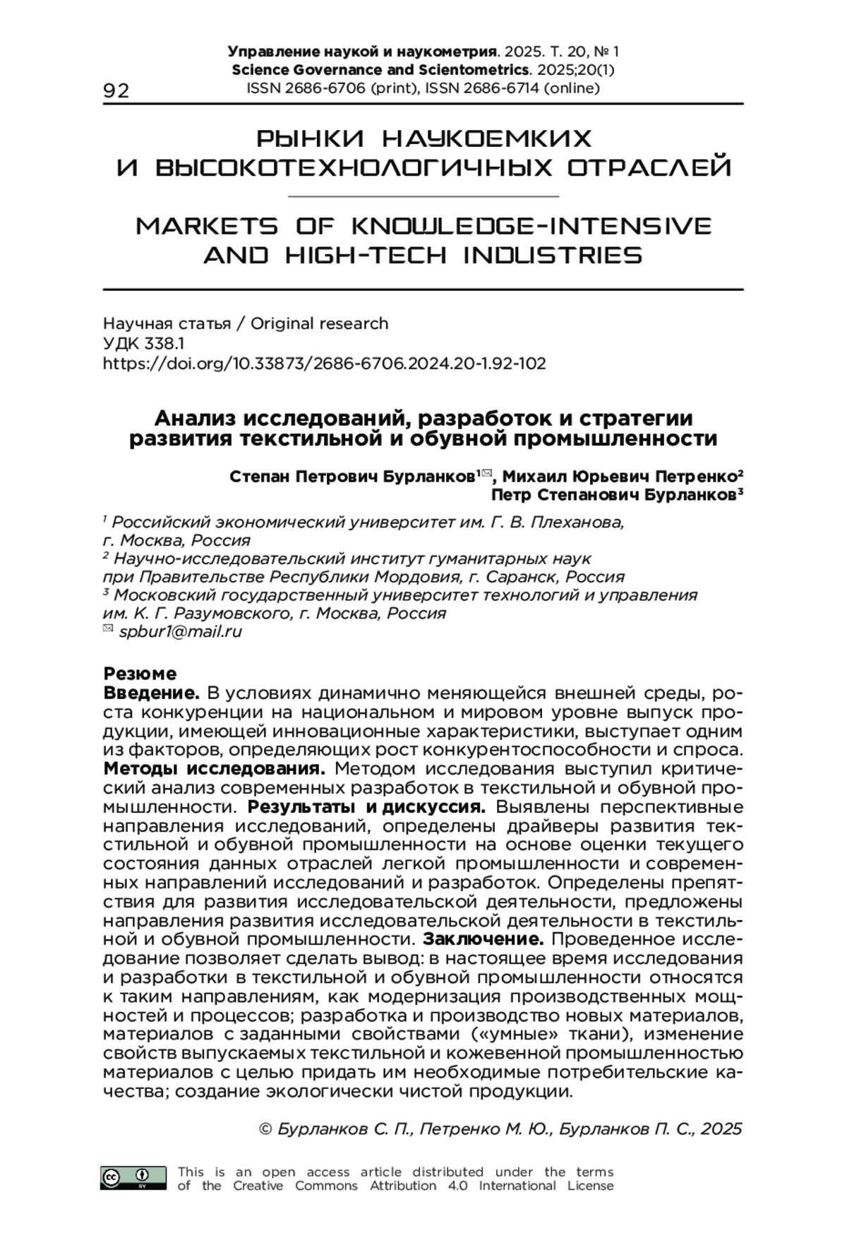 БУРЛАНКОВ С. П., ПЕТРЕНКО М. Ю., БУРЛАНКОВ П. С. АНАЛИЗ ИССЛЕДОВАНИЙ, РАЗРАБОТОК И СТРАТЕГИИ РАЗВИТИЯ ТЕКСТИЛЬНОЙ И ОБУВНОЙ ПРОМЫШЛЕННОСТИ // УПРАВЛЕНИЕ НАУКОЙ И НАУКОМЕТРИЯ. 2025. Т. 20 № 1