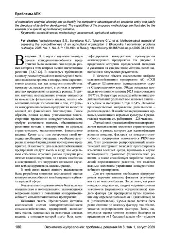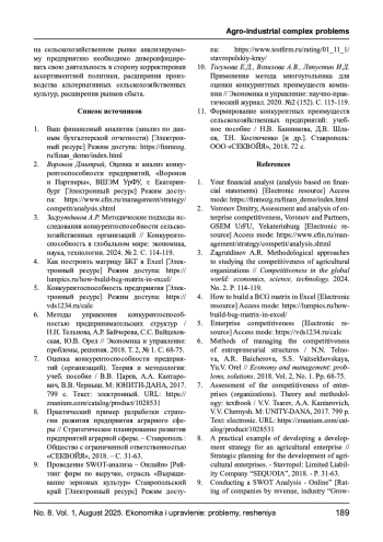 3. Загрутдинов А.Р. Методические подходы исследования конкурентоспособности сельскохозяйственных организаций // Конкурентоспособность в глобальном мире: экономика, наука, технологии. 2024. № 2. С. 114-119. EDN: AEZOYP