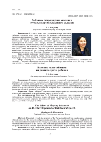 8. Сундуй Г. Д. Формирование добросовестных отношений у дошкольников в процессе сюжетно-ролевой игры (на материале тувинской игры сайзанак) // Мир науки, культуры, образования. 2015. № 2 (51). С. 143–146.