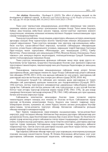 4. Мендот Эл. Э., Мендот И. Э., Мендот Эм. Э., Монгуш В. Б. Игра «Сайзанак» детей кочевого народа // Педагогико-психологические и медико-биологические проблемы физической культуры и спорта. 2022. № 17(2). С. 154–160. DOI: 10.14526/2070-4798-2022-17-2-154-160 EDN: GKQWRK