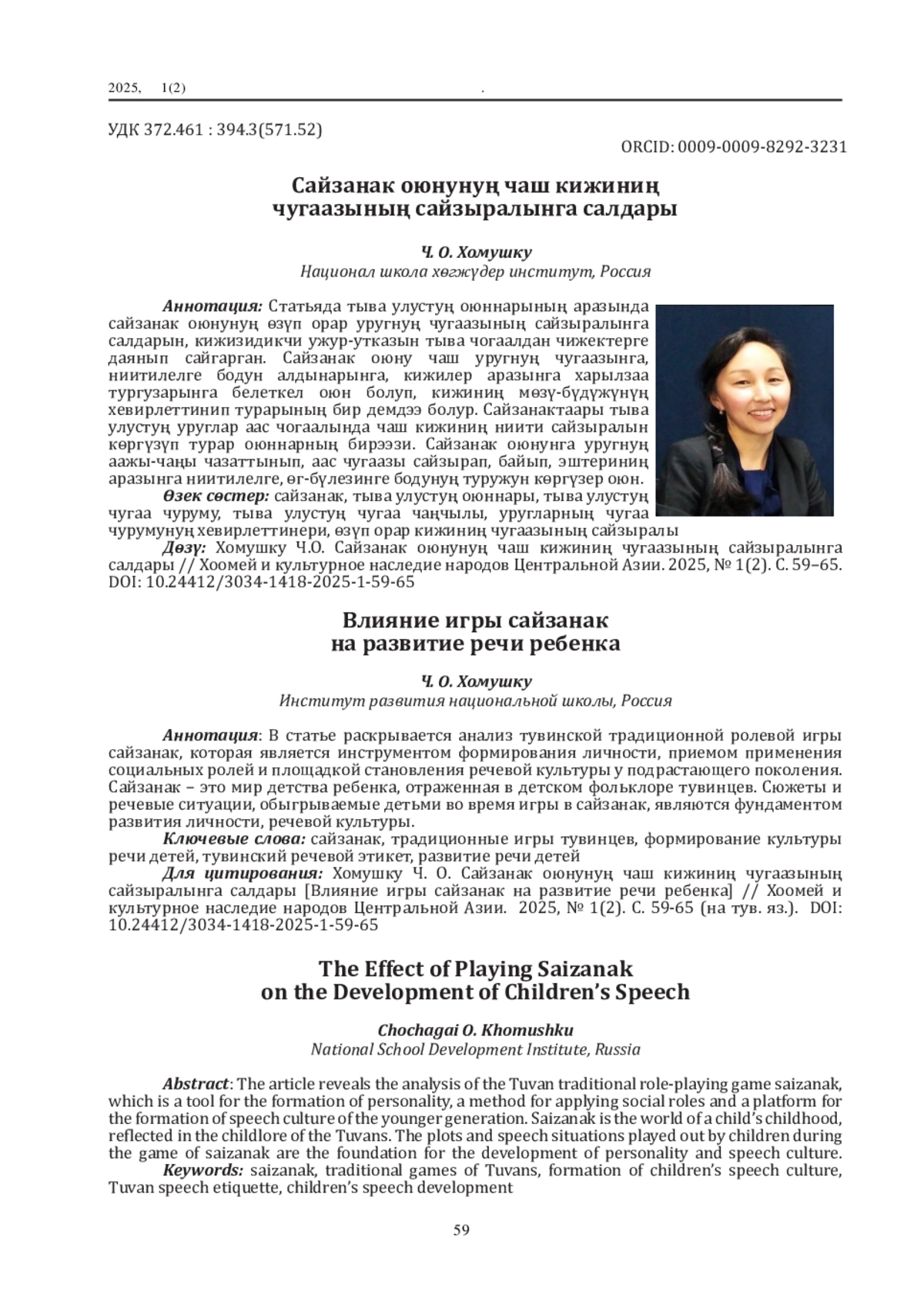 8. Сундуй Г. Д. Формирование добросовестных отношений дошкольников в процессе ролевой игры (на материале тувинской игры сайзанак) // Мир науки, культуры, образования. 2015. № 2 (51). С. 143-146.